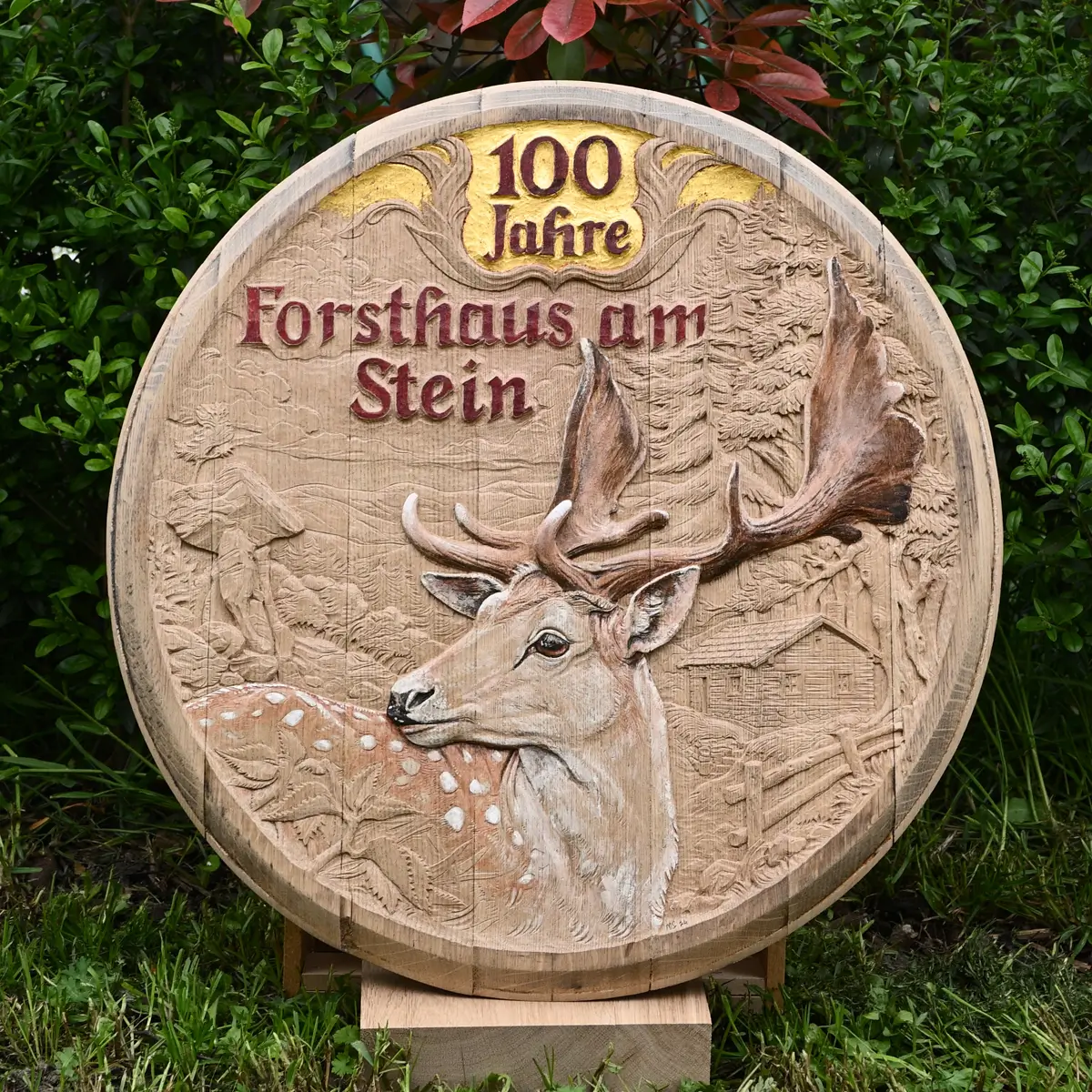 Barrel lids are not only a real highlight as individual decorative pieces, but are also ideal for cladding walls. In addition to the possibility of using barrel lids as wall installations, they can also be used as shelves. Hand-carved barrel heads are a particularly unusual feature. In collaboration with a talented artist, various motifs are carved into the wood with great attention to detail. Our barrel lids are available in various sizes, and you can even find the head of a large barrel in our range.