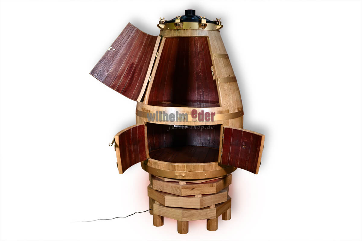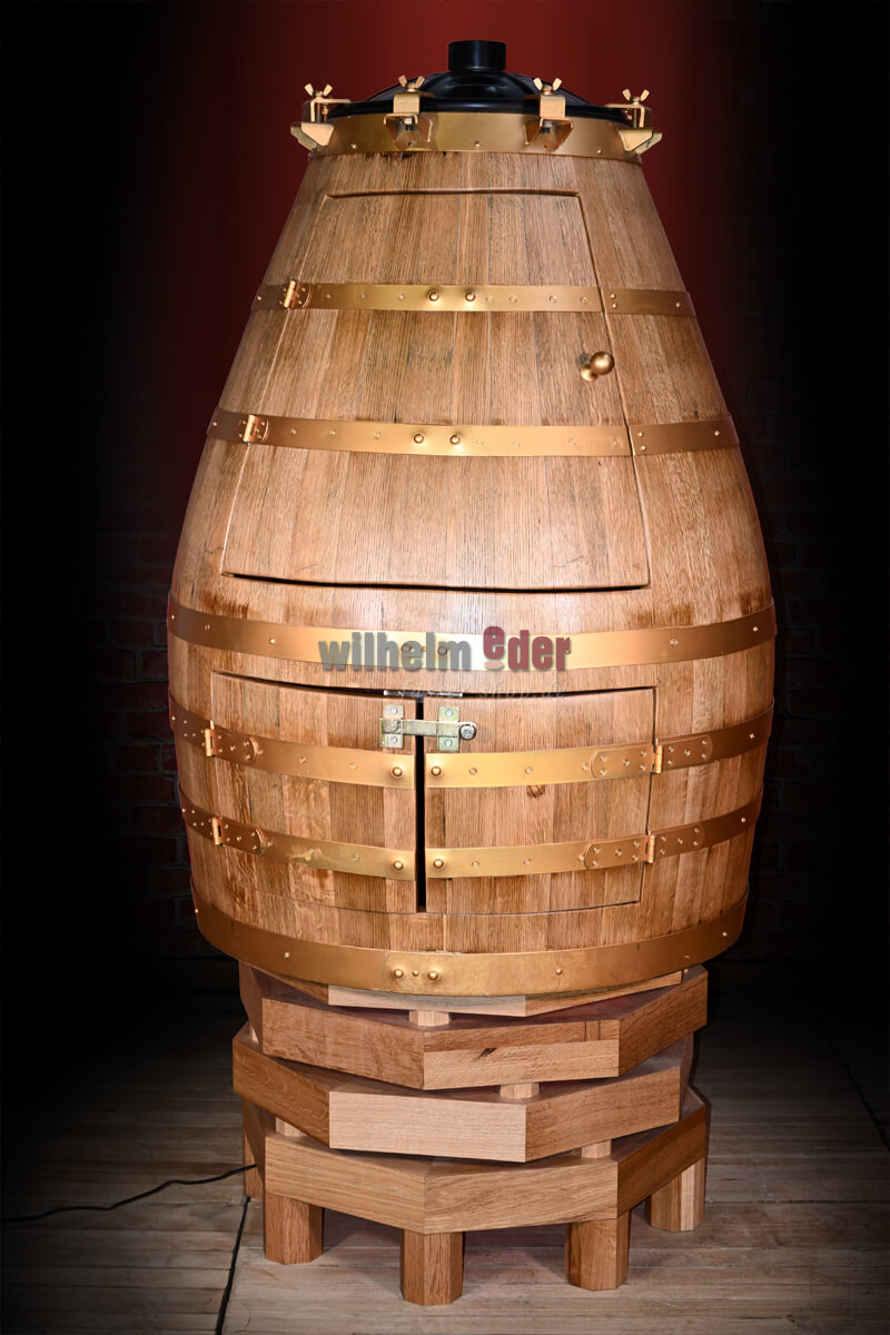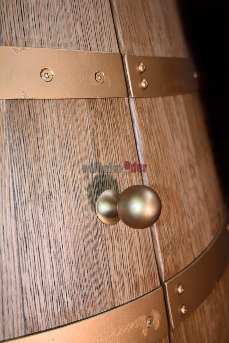 Before making shelves, we let the barrels dry and glue the staves individually. This elaborate process ensures the stability of the shelf and prevents the wood from warping due to temperature fluctuations. Please note, however, that too dry and warm heating air does not do the barrel good.
