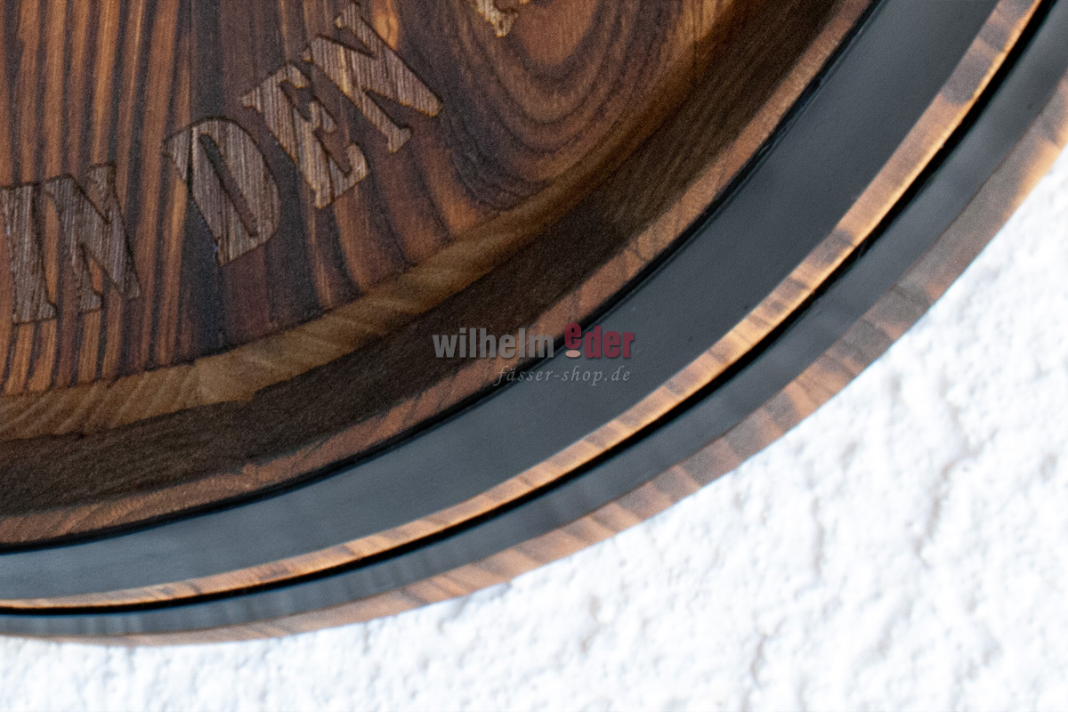 Our carpentry workshop produces decorative barrel head sections from chestnut barrels. For chestnut barrels, the head is cut off at 12-14 cm (depending on where the barrel hoops are placed). The barrel head sections are cleaned, sanded, glued, flamed and oiled in our joinery. The barrel hoops are painted black.