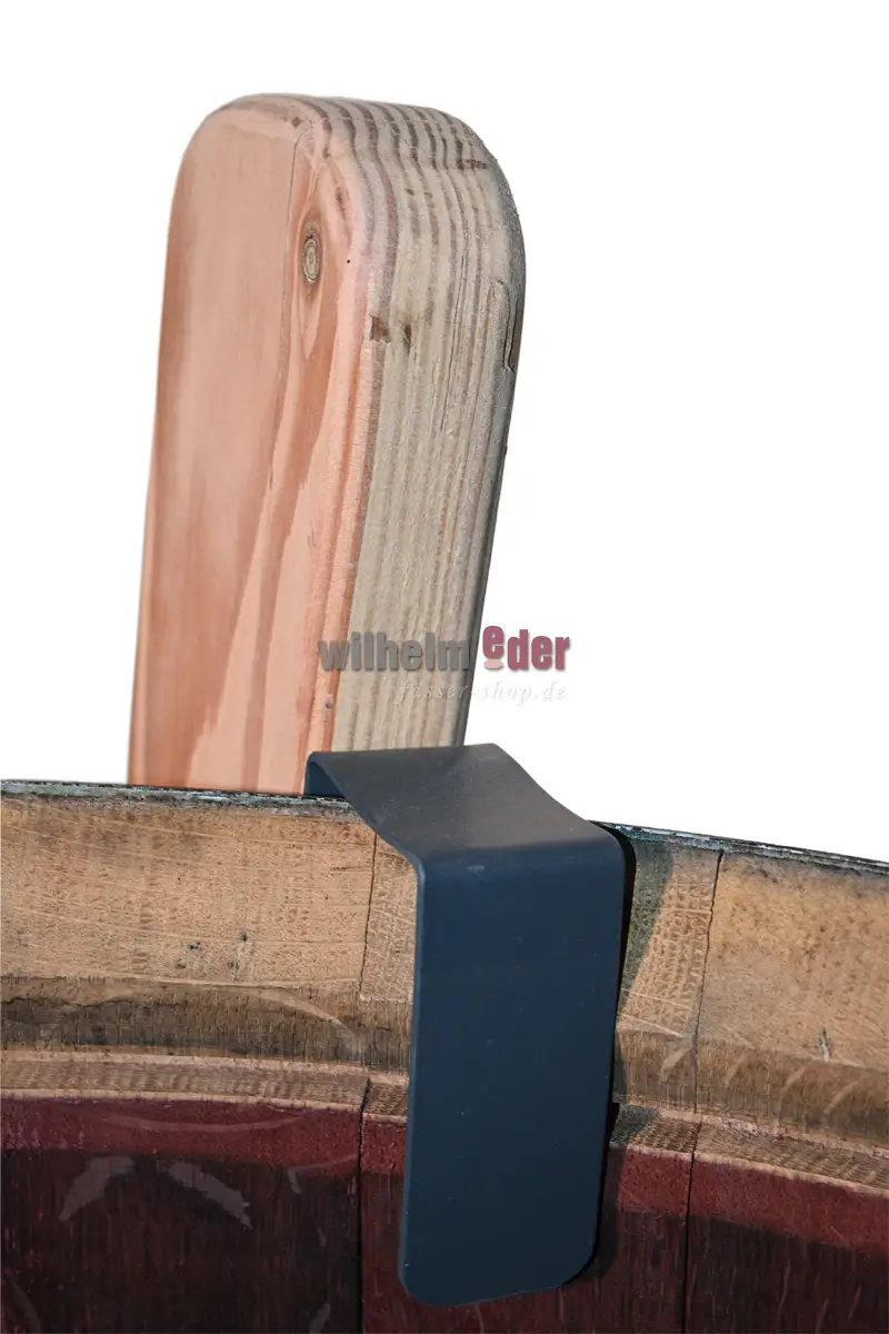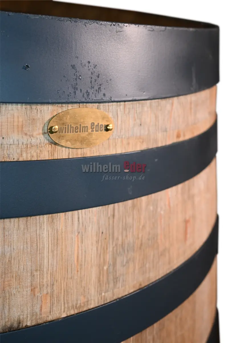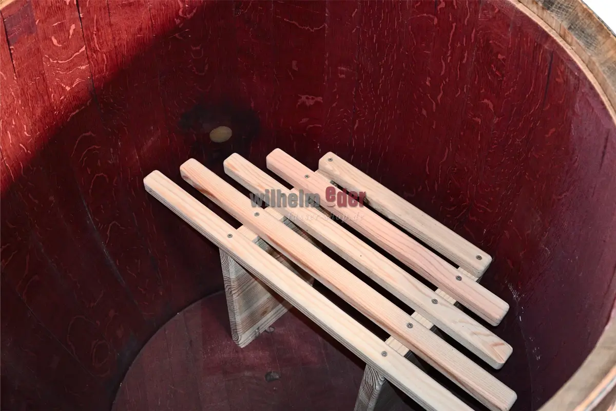 Bath barrel from a used 400 l barrel with boarding ladder and bench. The barrels are fill tight and may have staining from the red wine aged in them. The barrel is refurbished in our carpentry, sanded and the hoops are painted.