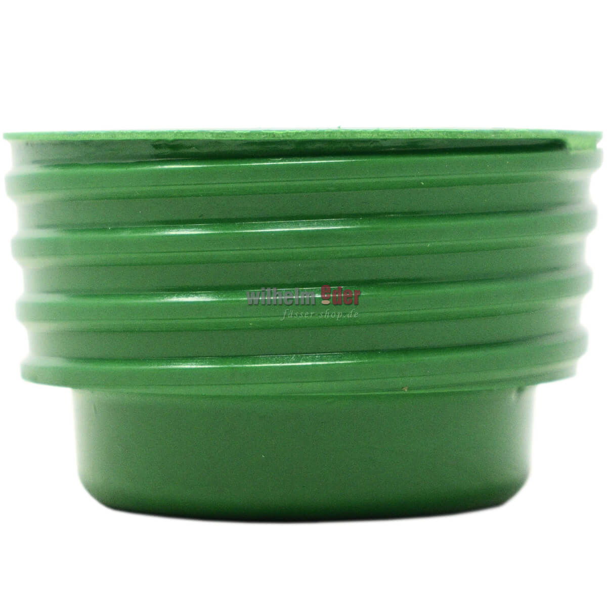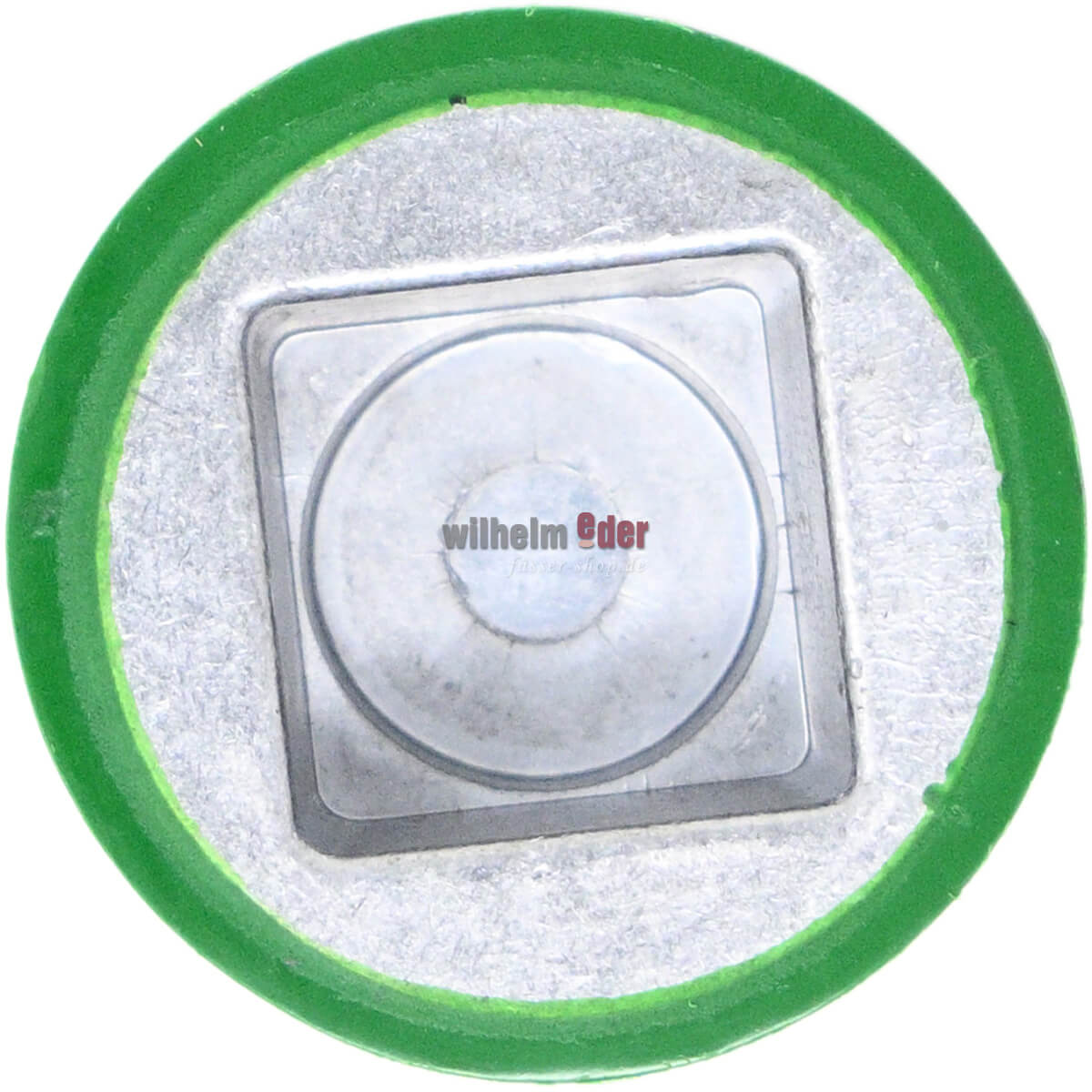 The screw is equipped with a square socket and a green plastic coating. It seals without an additional bung.
