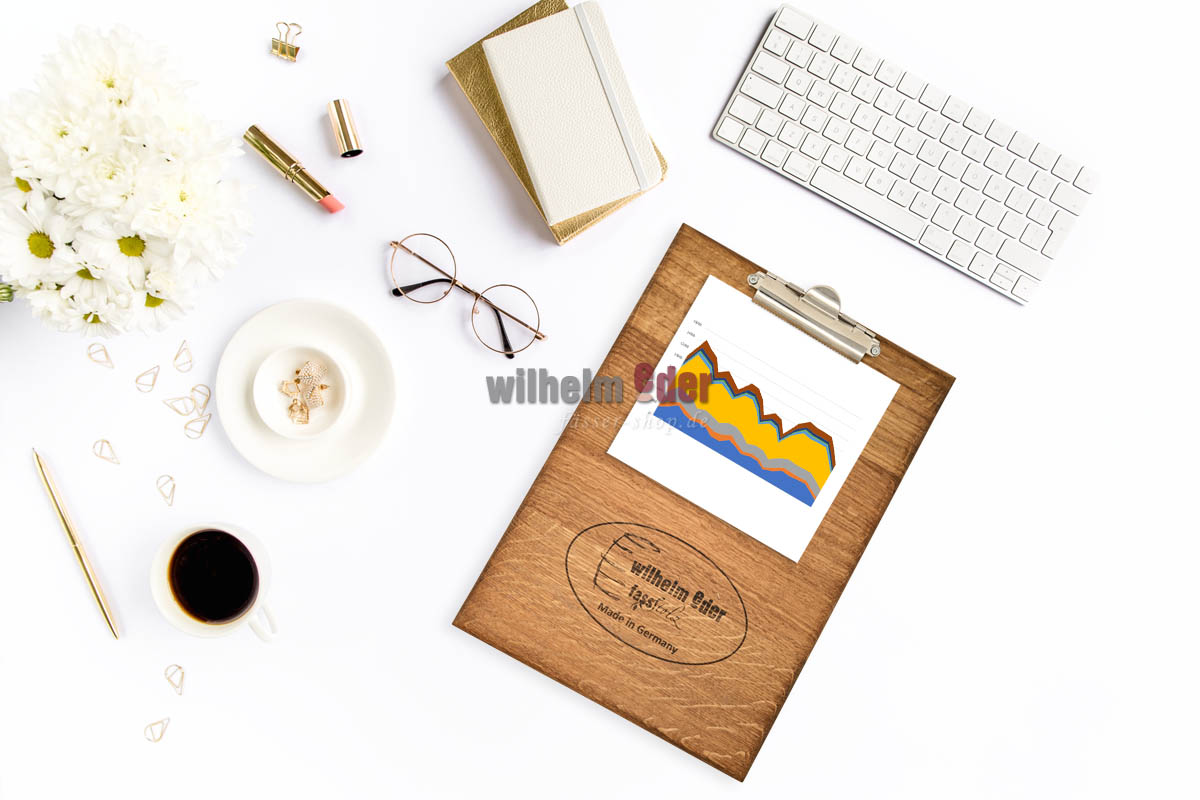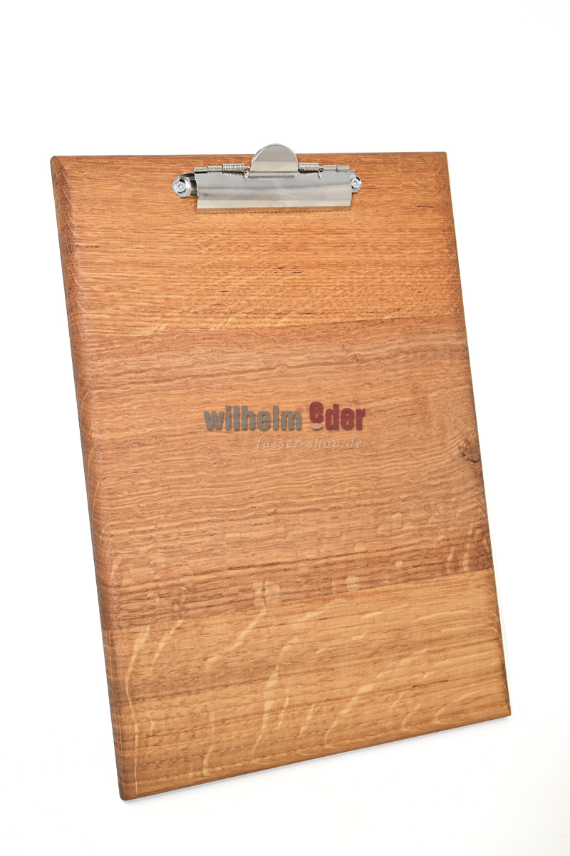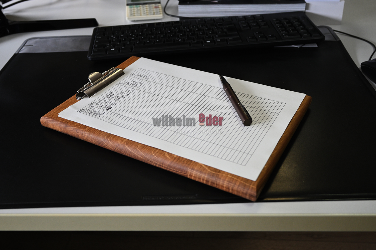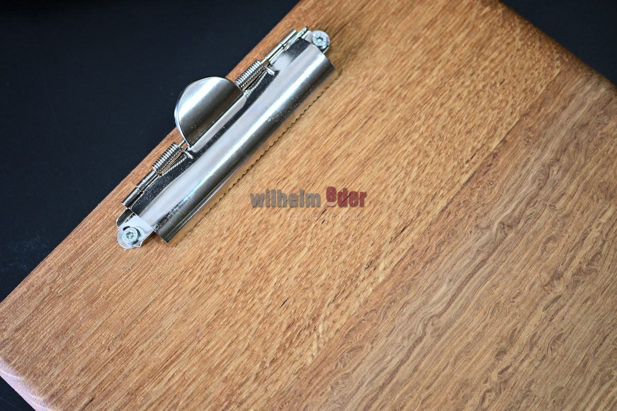 The price includes an individual laser branding. All we need is a template from you, exclusively in black and white, in the form of a PDF file, by e-mail to laser@wilhelm-eder.de (please include the order number). The durable clipboards are finished with oil.