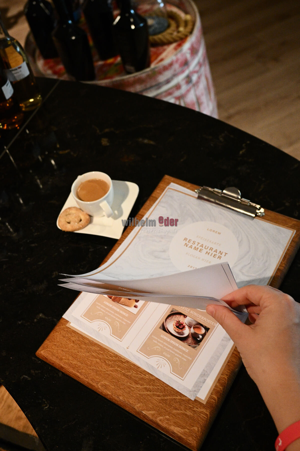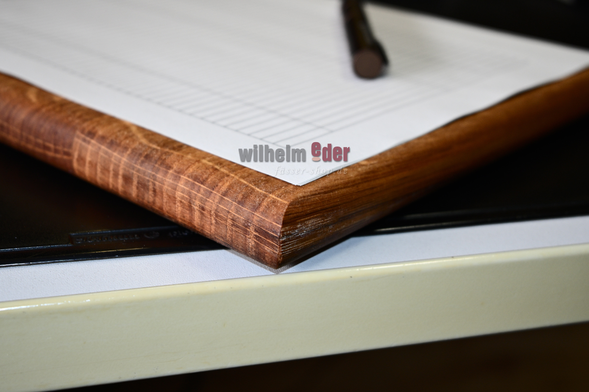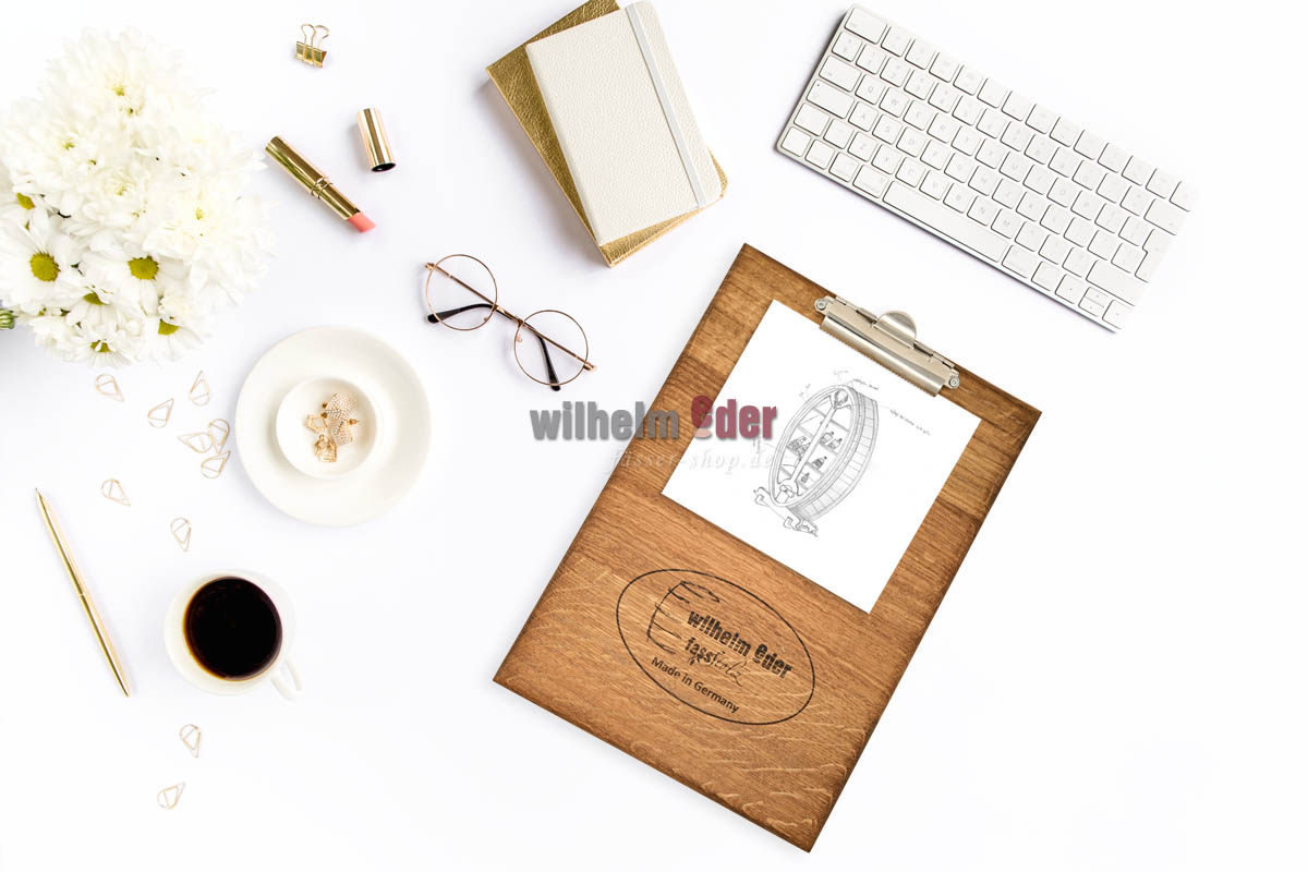 The price includes an individual laser branding. All we need is a template from you, exclusively in black and white, in the form of a PDF file, by e-mail to laser@wilhelm-eder.de (please include the order number). The durable clipboards are finished with oil.