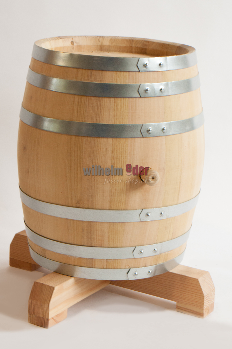 Rain barrel made from a used, light-coloured oak barrique barrel with black or galvanized hoops. The lid has been removed and fitted with a wooden handle. The barrel is only a few years old and therefore only slightly darkened and in very good condition.Includes:- Built-in drain tap made of polished brass as a water drain - ¾" thread, the tap is mounted in a position where the outlet is approx. 25 cm above the bottom of the barrel.- Wooden support cross (natural look) made of two wooden brackets that can be placed inside each other (shipping incl. 2 screws for self-assembly)Each oak barrel is unique. Different colors are caused by the precious contents that were once stored in it. Small notches in the wood or minor unevenness are not quality defects, but are rather due to the unique construction and previous use of the barrels.