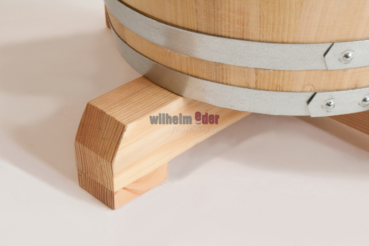 Original water reservoir for watering lawns, plants, trees, fruit and vegetables in the house and garden, made from air-dried oak or Douglas fir (as option oak wood). Don't just let rainwater seep away, catch it with this beautiful piece from our cooperage. We also build your rain barrel according to your measurements and desired content size. Optionally available - connections for inlet and outlet as well as overflow. We strongly recommend placing the bucket on bearing beams, which can be ordered under accessories.