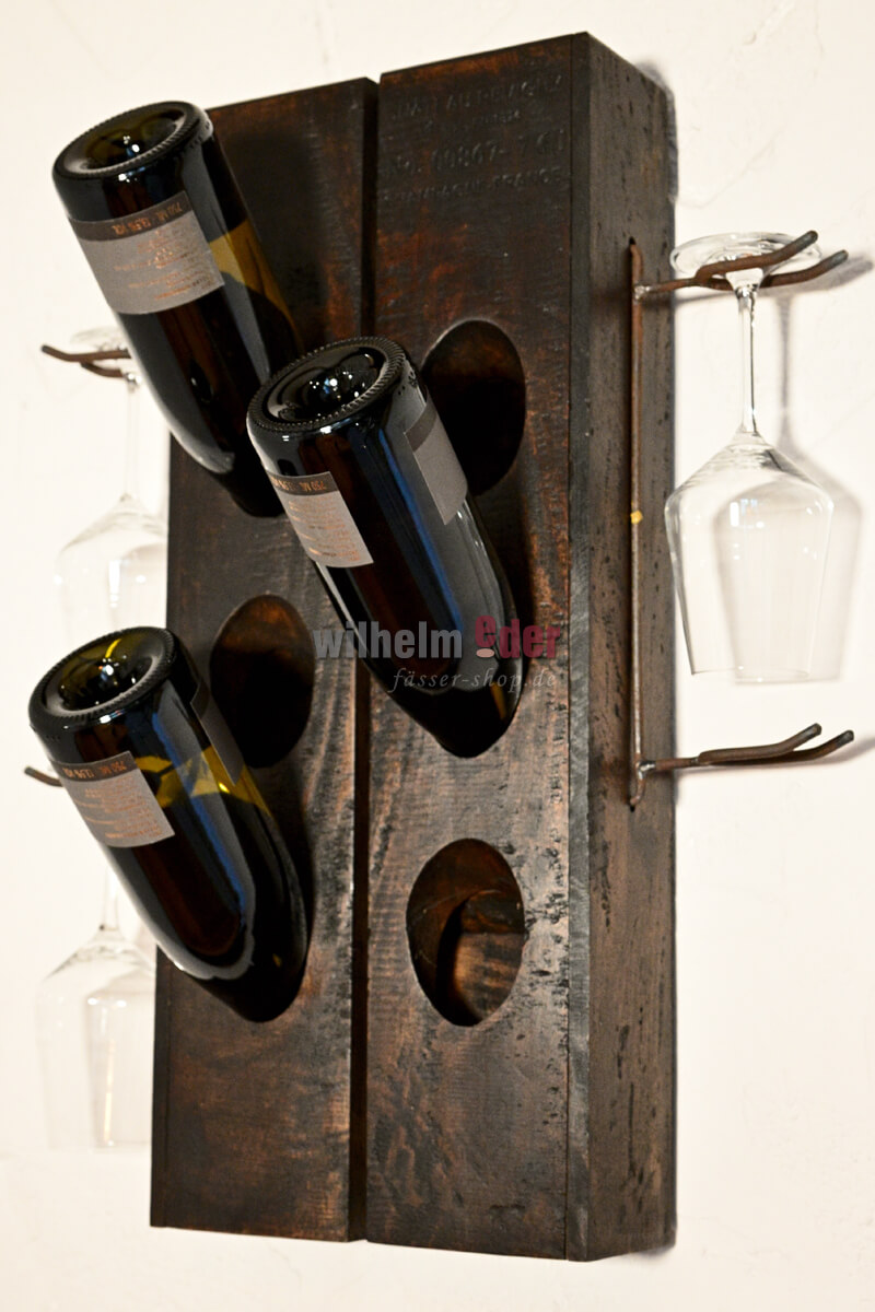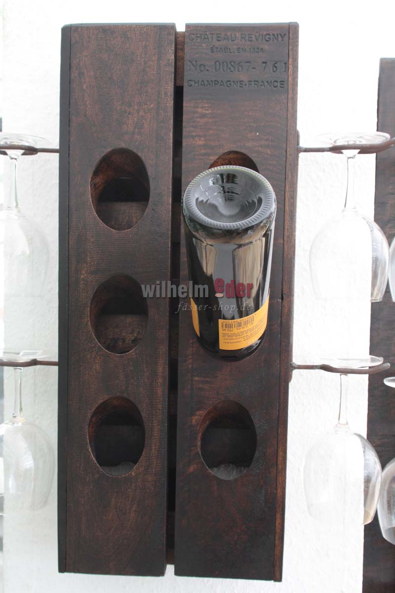 This champagne rack is made of wood, rustic-style and incl. wall mounting, screws and dowels as well as suitable glass holders on each side of the champagne rack.