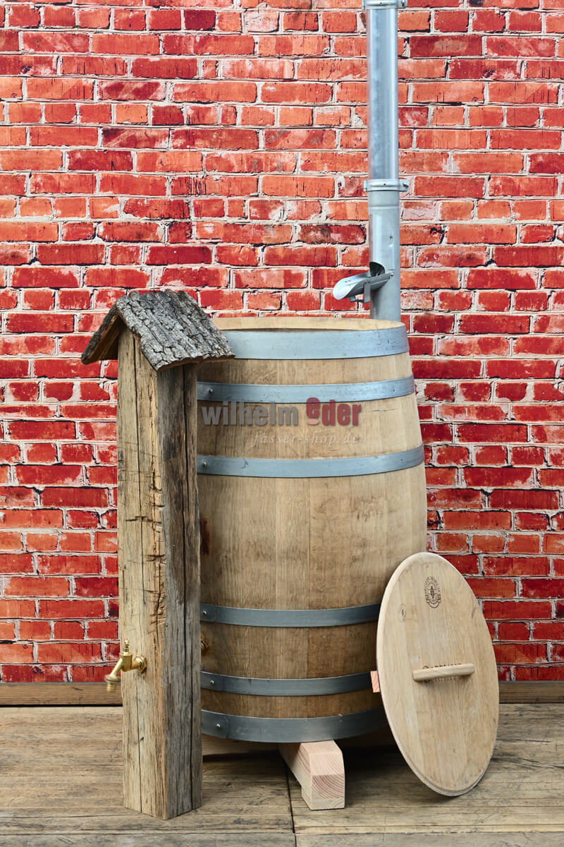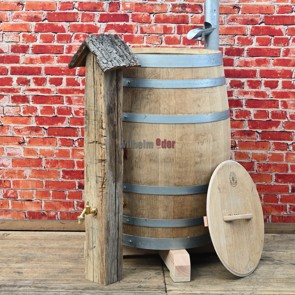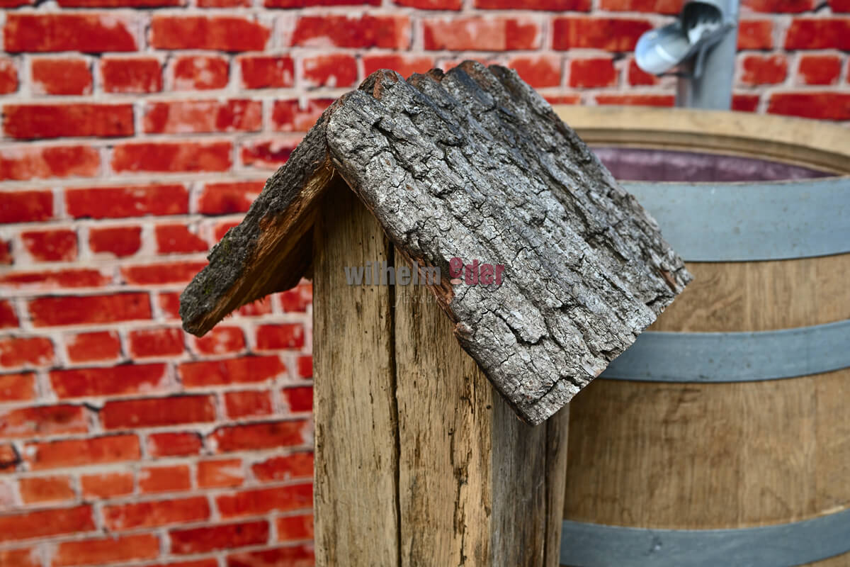 The oak beam is untreated and comes from an old half-timbered house. The roof is made of tree bark. Our carpenters drilled a hole through the beam for the tube and tap, and installed the tap and connections. These will automatically be installed when ordered in combination with a rain barrel.