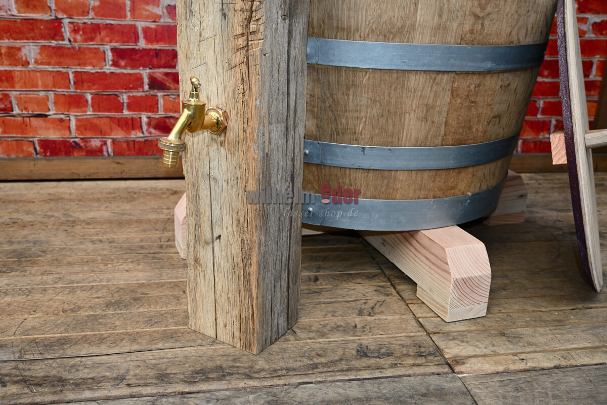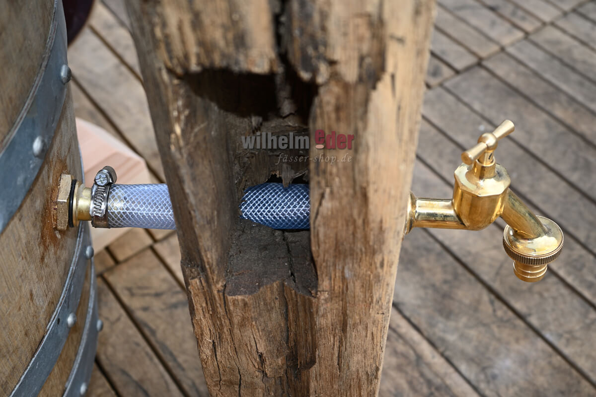Please note that the tap in the picture was installed at about 35 cm from the bottom of the wooden truss, to match the 225 l rain barrel on a storage cross. Thus, a watering can fits perfectly under it.