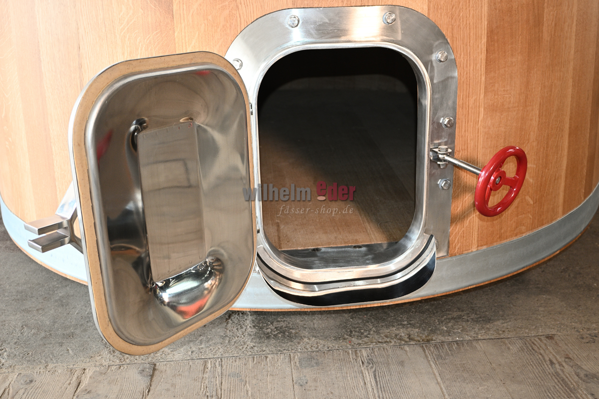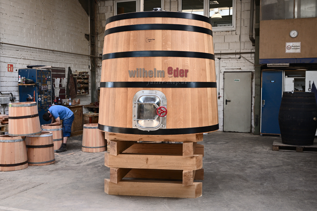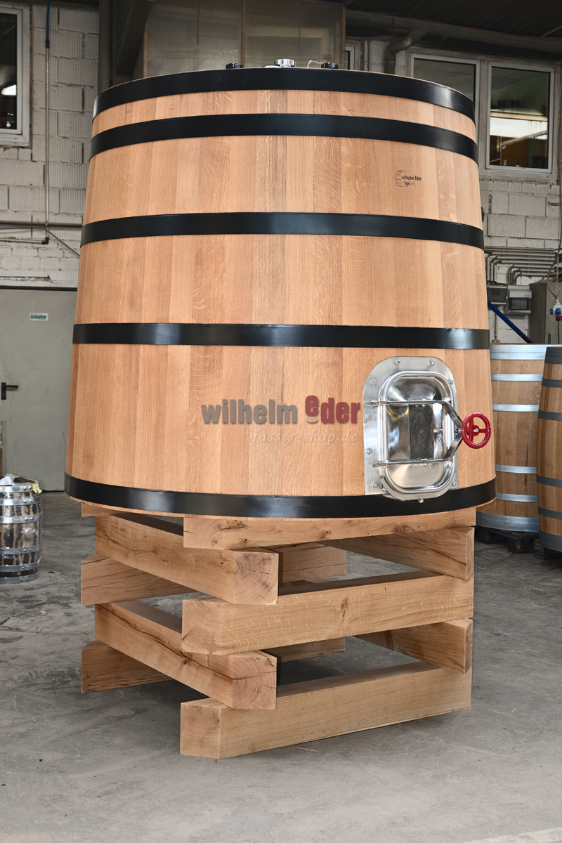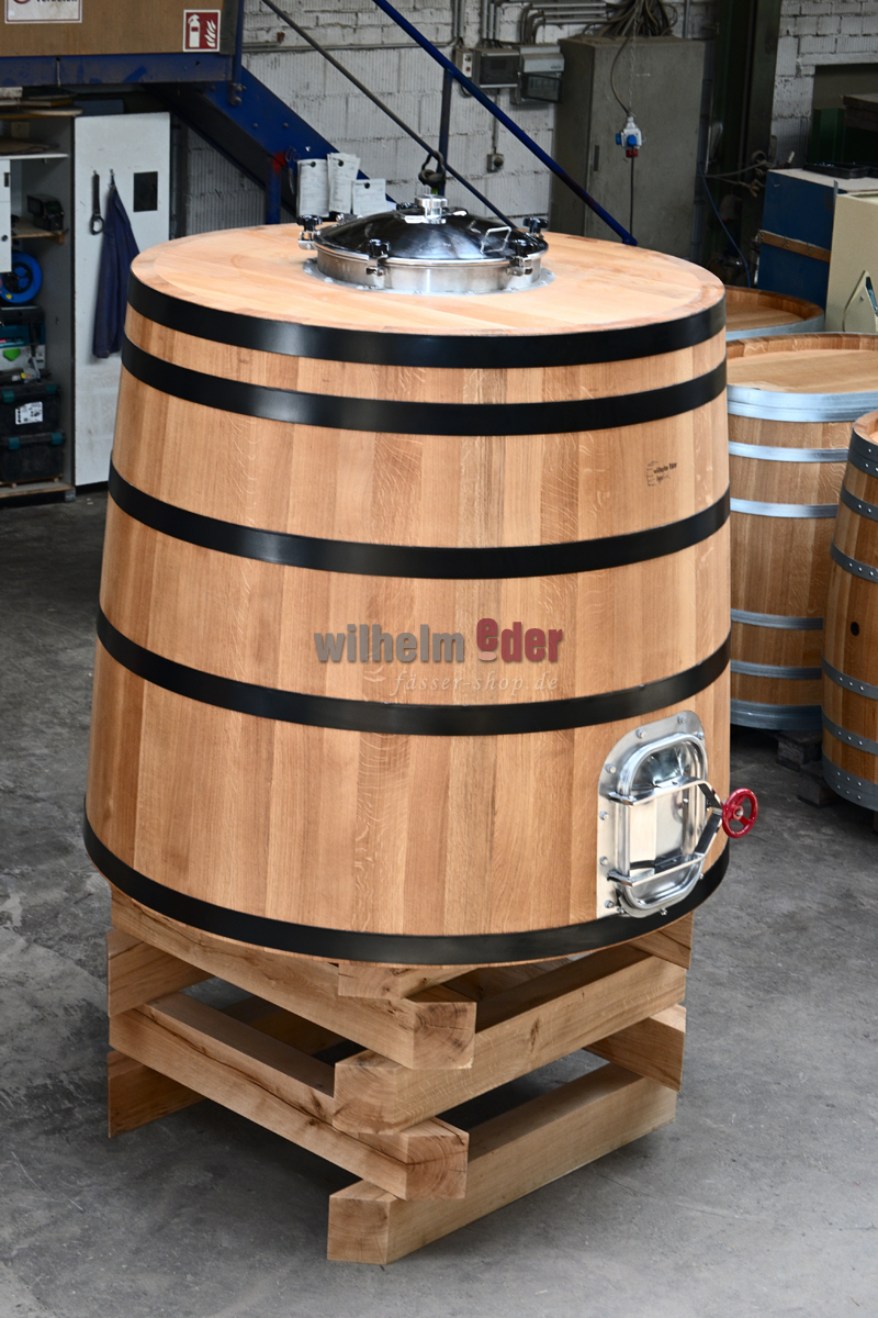 The fermentation vat is fitted with hot-dip galvanized steel hoops, optionally with black painted hoops. The finishing was done with a food-safe, alcohol-resistant clear varnish.