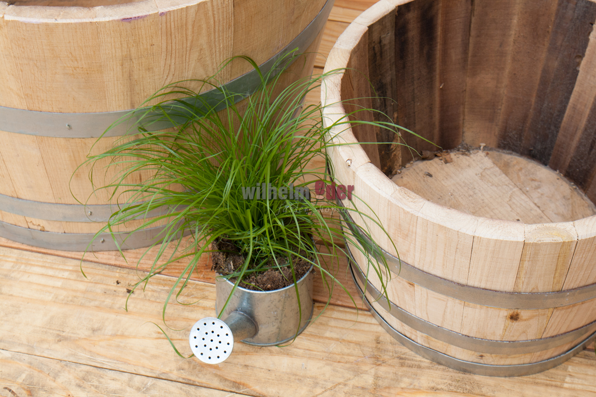 Made of chestnut wood with metal hoops. These flower pots are below the measurements of the standards pots of a 225 l barrel.