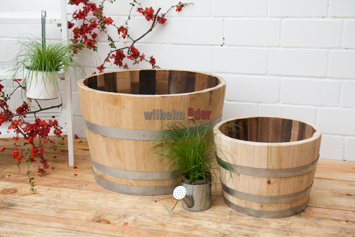 Flowerpot -  made from a 225 l barrique barrel The choice is yours: opt for the individual 3/4 flower pot or benefit from the special freight price when purchasing a set - consisting of a 3/4 and a 1/4 flower pot Ideally suited for larger plants or shrubs. The tubs are made from old oak red wine barrels and are in  a good condition. The tubs are waterproof and can therefore be used as small ponds. The hoops are hot-dip galvanised, the head hoop at the bottom can also be made out of Willow. When planting the pots, we strongly recommend holes are drilled in the bottom of the container for water drainage. At the end of the order, you can let us know in the comments field if you would like to have this option - This service is free of charge for you!   Tubs made of oak with galvanised hoops. The barrels show signs of use and red wine stains. Dimensions 3/4 flower pot approx.:Height: 67cmØ Top: 66cmØ Bottom: 52cm Dimensions 1/4 flower pot approx:Height: 29 cmØ top: 66 cmØ bottom: 50 cm Making your courtyard and garden greener doesn’t just show a love of nature but it can also create a congenial and aesthetic scene in any home. Where flowers, perennials and small trees flourish, everyone can enjoy their company. Of course, every plant needs the right size flowerpot. Tubs made from wooden barrels are not only sustainable but are also naturally beautiful options. The barrels all have different varnishes or colourings from their first life, so the flowerpots don’t just look absolutely amazing. Wood is a renewable resource and is one of the most sustainable, when used correctly. We not only make new flowerpots, but also give used wine barrels a second life in your garden. Something more natural is not possible. Every oak barrel is unique. The different colorations are caused by the valuable contents that they once contained. Small notches in the wood or small bumps are not quality defects but rather caused by how it was made and how the barrel was used. All pictures are examples, color variations are possible.