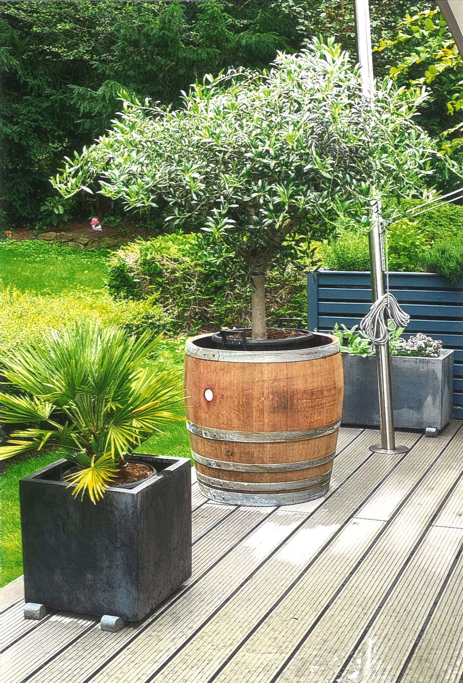 Making your courtyard and garden greener doesn’t just show a love of nature but it can also create a congenial and aesthetic scene in any home. Where flowers, perennials and small trees flourish, everyone can enjoy their company. Of course, every plant needs the right size flowerpot. Tubs made from wooden barrels are not only sustainable but are also naturally beautiful options. The barrels all have different varnishes or colourings from their first life, so the flowerpots don’t just look absolutely amazing. Wood is a renewable resource and is one of the most sustainable, when used correctly. We not only make new flowerpots, but also give used wine barrels a second life in your garden. Something more natural is not possible.