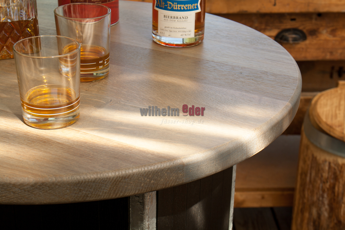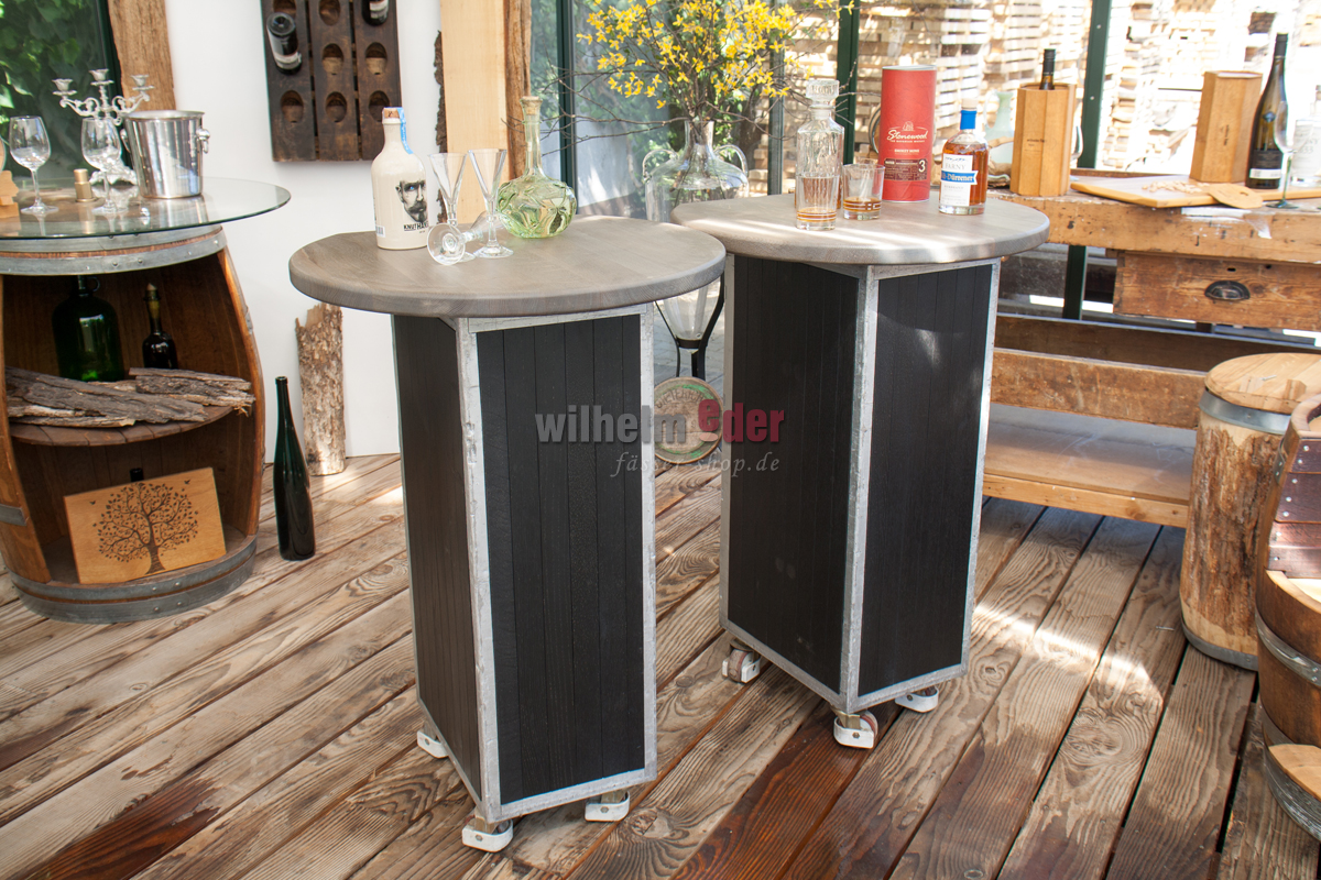 Round oak tops: Two round oak tops make it possible to convert the trolleys into a stylish high table. They can also be used individually, if space conditions do not allow otherwise.