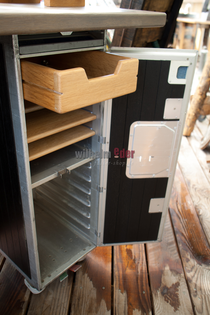 Trolleys: two completely overhauled, fully functional airline trolleys, covered on the outside with stave veneer and treated with different stains. Inside the trolleys are equipped with compartments, holders or drawers for bottles, cutlery, glasses, brochures and much more. We will be happy to cater to your every wish.
