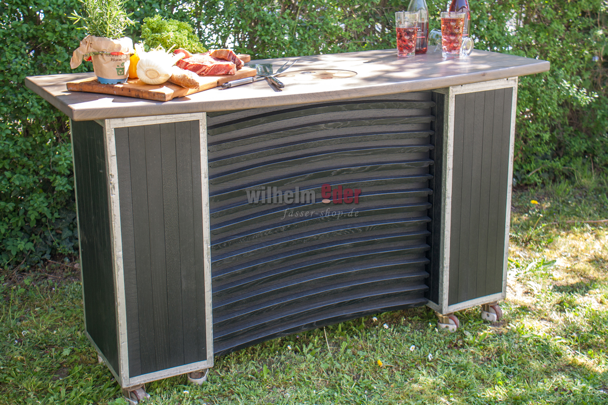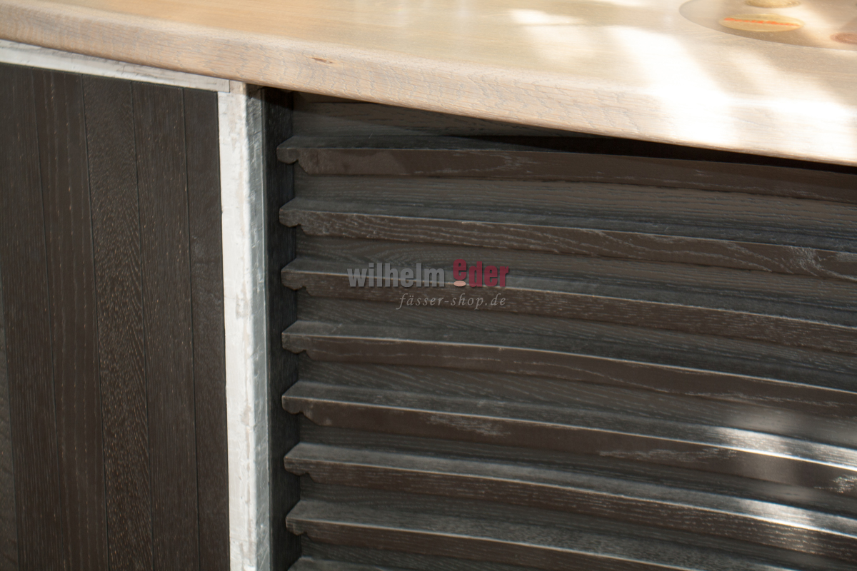 Front cladding: The front cladding of the counter consists of barrel staves and rounds off the appearance of the entire counter in an attractive way.