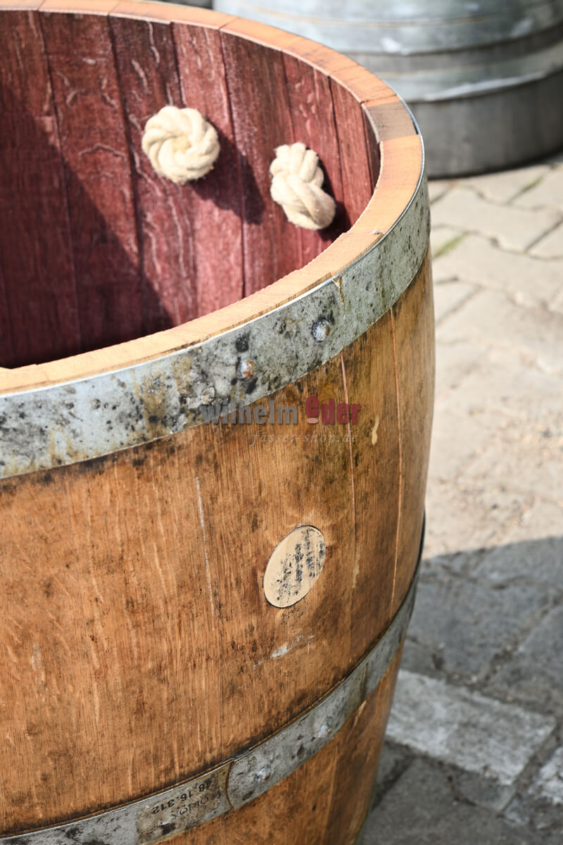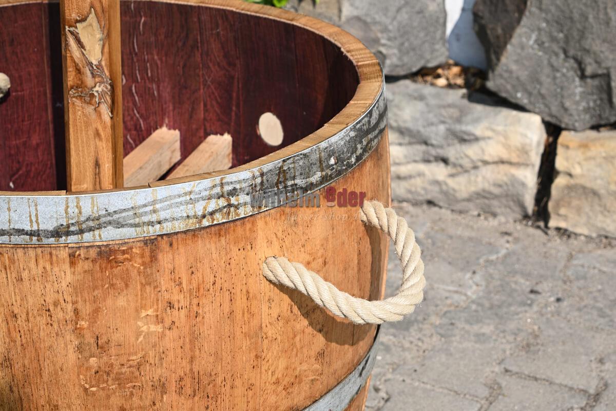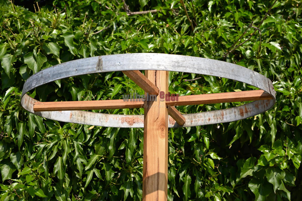 With our planter made from a ¾ used 225 l wine barrel and a barrel ring, mounted above on a wooden stake and a cross brace! The plants use the wooden stake and the barrel hoop as a stylish support and climb up it.
