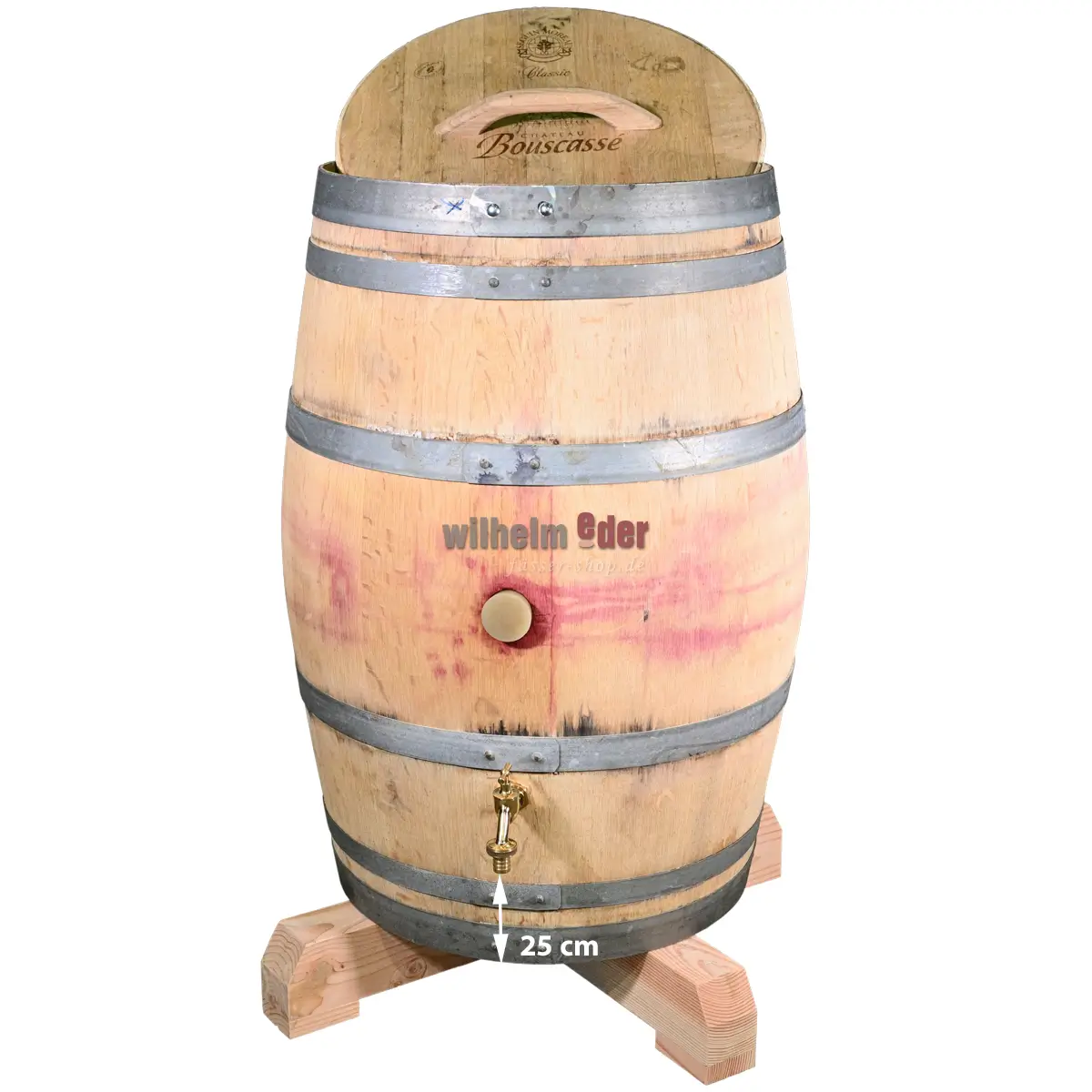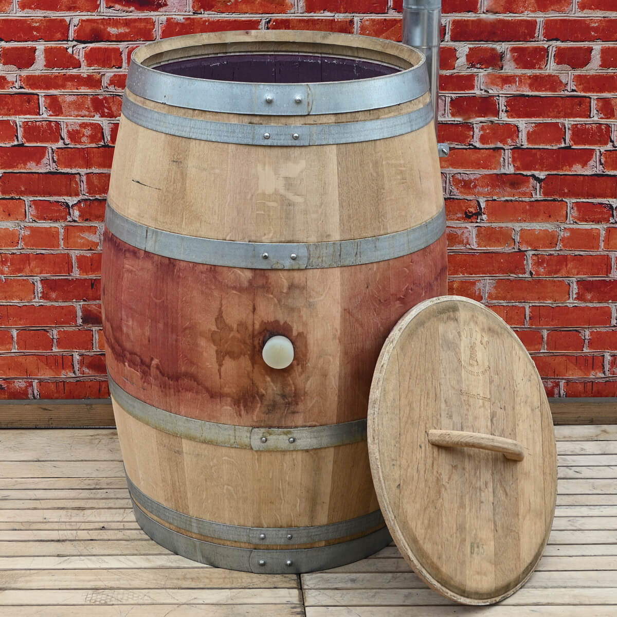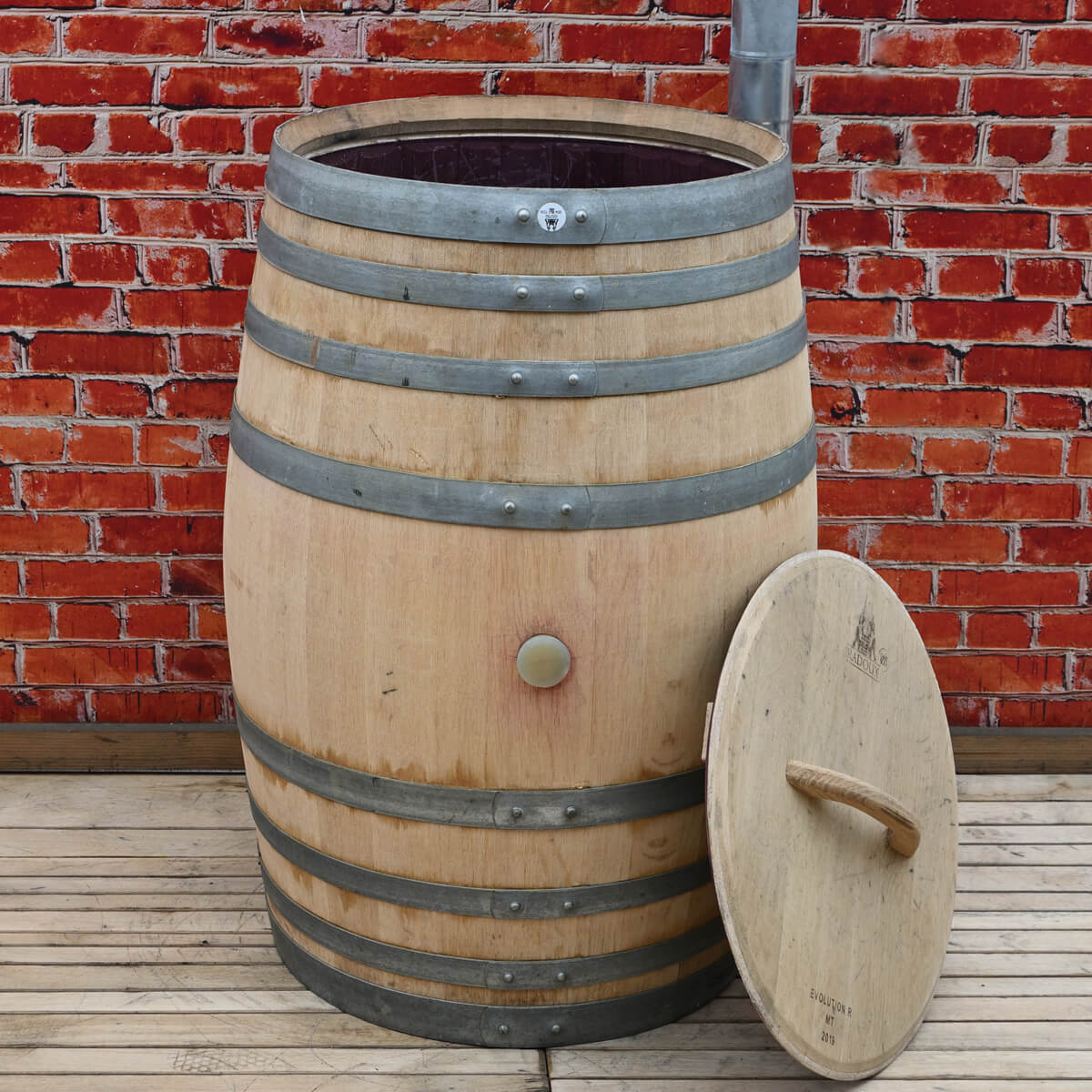 - Description Rain barrel made from a used, light-coloured oak barrique barrel with black or galvanized hoops. The lid has been removed a… More