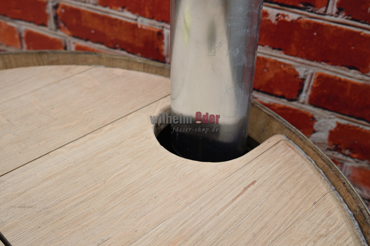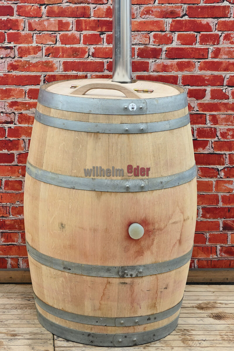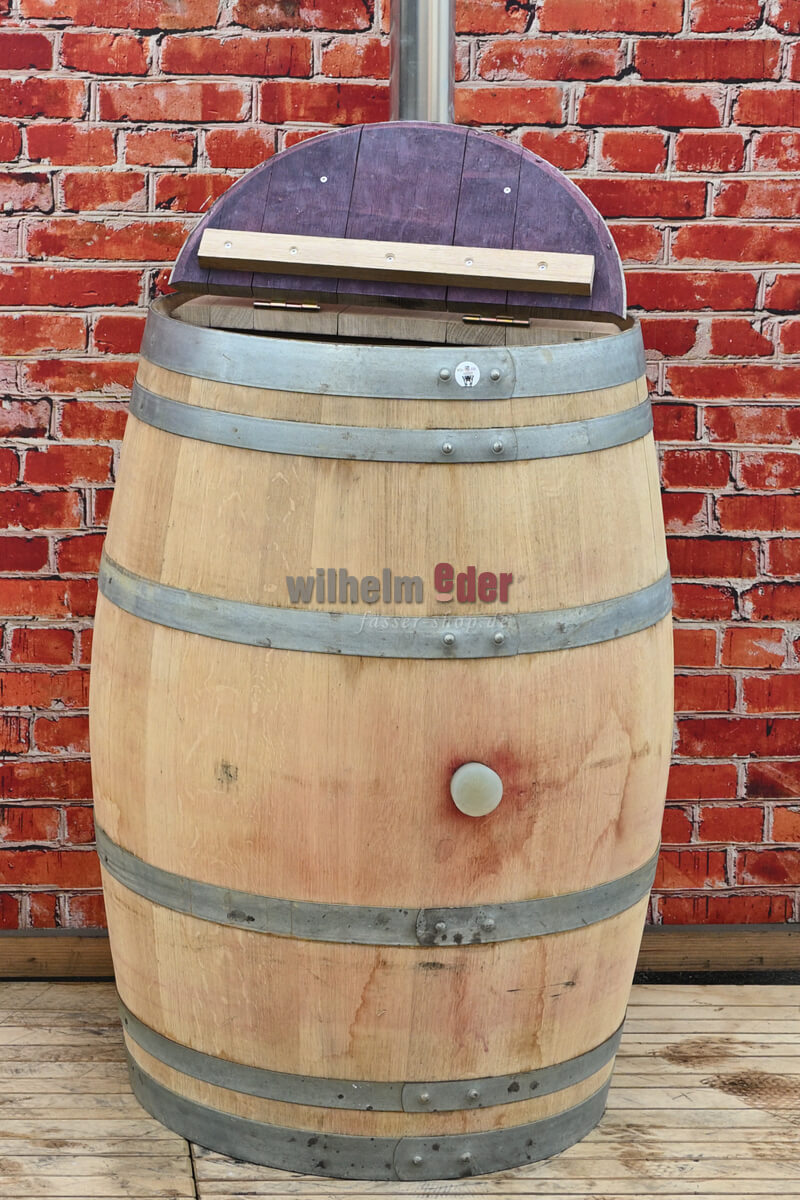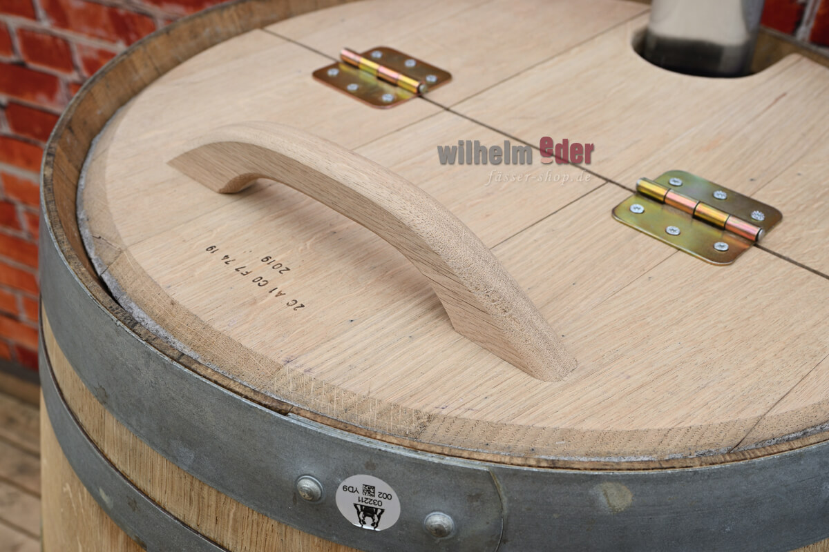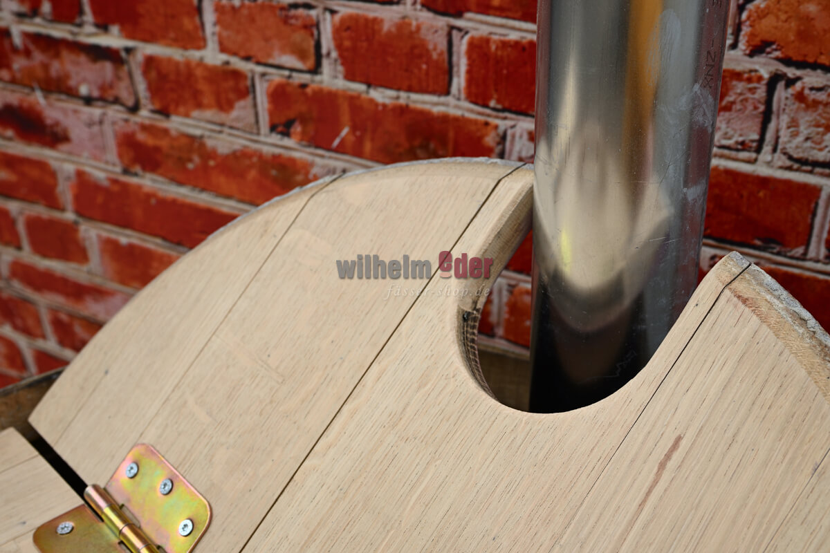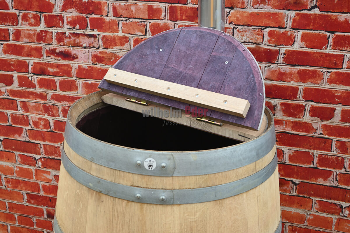 The hinged split lid is mounted with two hinges and a wooden handle, so it is easy to open. The fixed section has a recess on the side through which you can insert a downpipe up to a diameter of 100mm directly into the barrel.