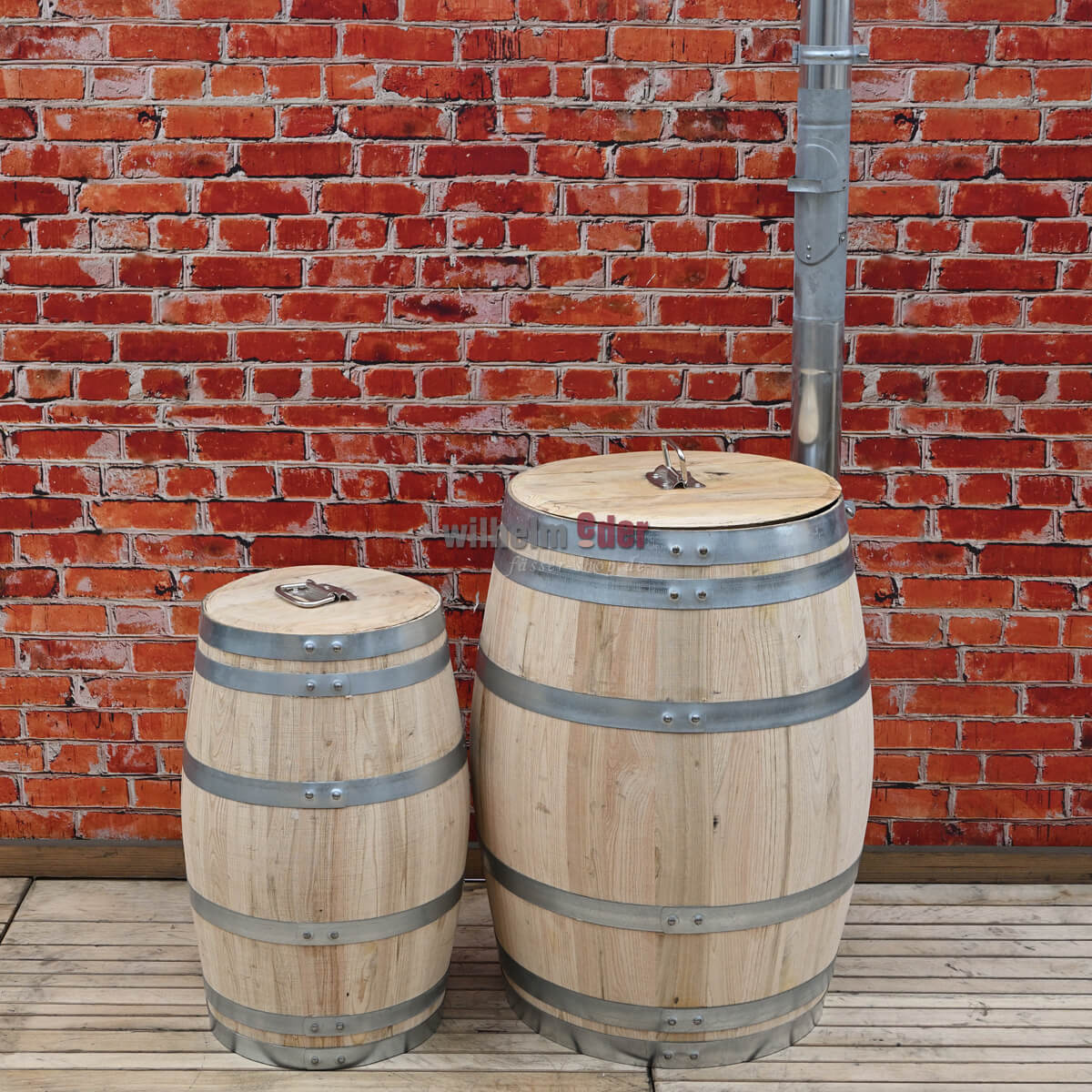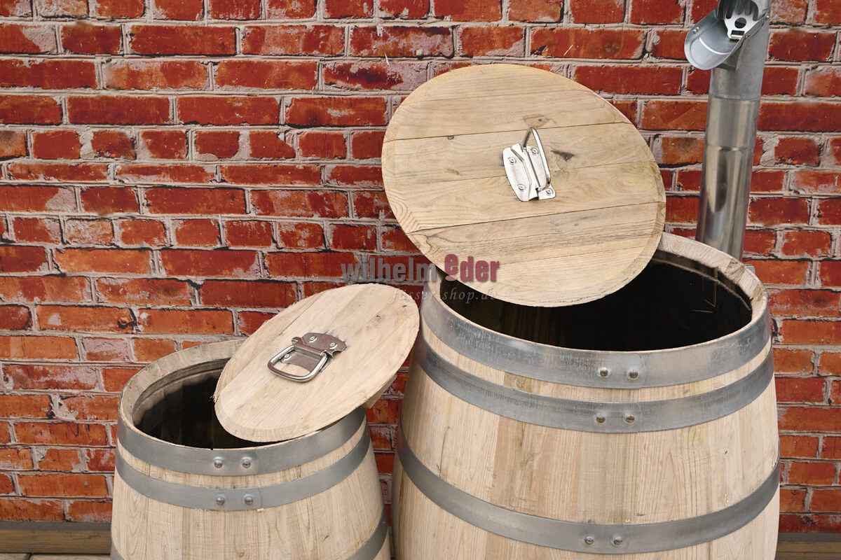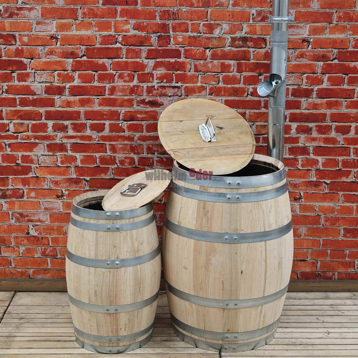 Rain barrel made from a used, light-coloured oak barrique barrel with black or galvanized hoops. The lid has been removed and fitted with a wooden handle. The barrel is only a few years old and therefore only slightly darkened and in very good condition.Includes:- Built-in drain tap made of polished brass as a water drain - ¾" thread, the tap is mounted in a position where the outlet is approx. 25 cm above the bottom of the barrel.- Wooden support cross (natural look) made of two wooden brackets that can be placed inside each other (shipping incl. 2 screws for self-assembly)Each oak barrel is unique. Different colors are caused by the precious contents that were once stored in it. Small notches in the wood or minor unevenness are not quality defects, but are rather due to the unique construction and previous use of the barrels.