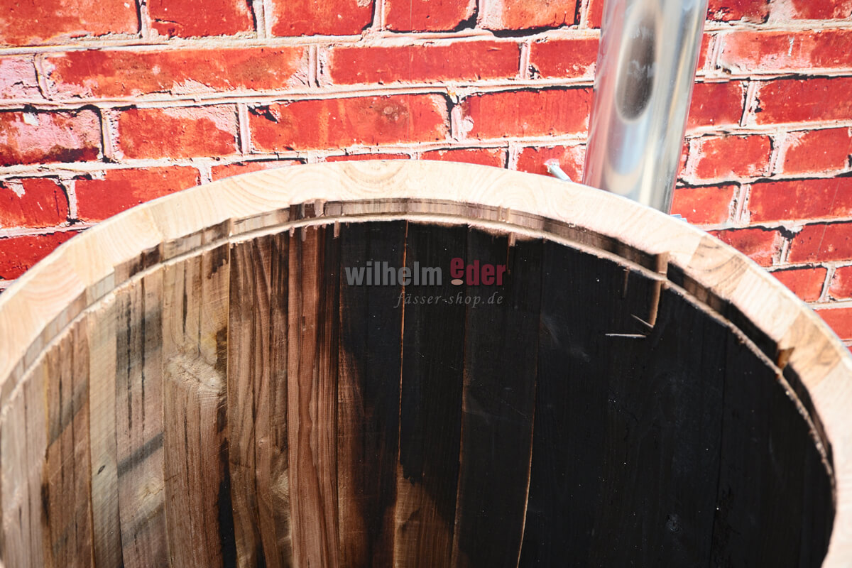 A characteristic of chestnut wood is that it quickly darkens. Untreated barrels change their appearance when exposed to the weather. The hoops may be very quickly affected by flash rust and the tannins wash out of the barrel (tan). Therefore, do not place the chestnut barrels on high-quality patio slabs or paving stones.