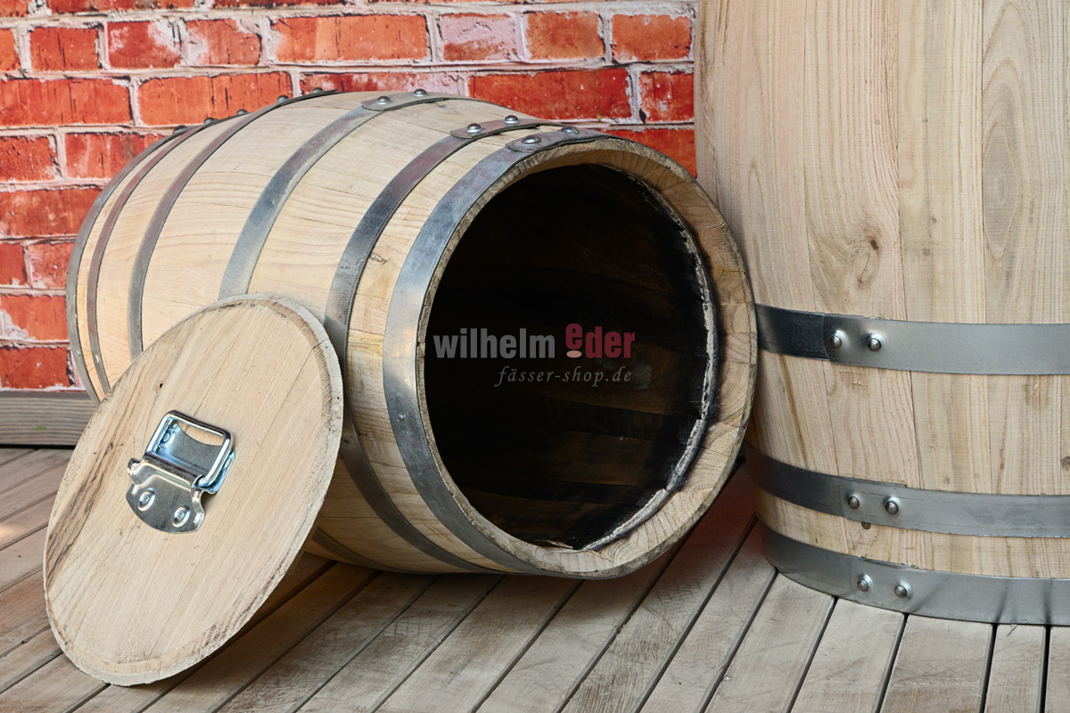 Rain barrel made from a used, light-coloured oak barrique barrel with black or galvanized hoops. The lid has been cut out and fitted with a wooden handle. The barrel is only a few years old and therefore only slightly darkened and it is also in a very good condition. Rain barrels used to collect rainwater are great all-rounders. The rain barrels, which were once used to age beer, wine or distillates, are not only an eye-catching item in a park or in your garden. Wooden barrels are, without question, the most sustainable way of collecting water, as wood is after all a renewable resource. Quite apart from the lovely look of the barrels and their decorative character, a ton of water will be saved. This is not only environmentally friendly, but also allows you to mete out every drop of water to your plants or animals living in your garden.Available in a variety of sizes and finishes, rain barrels are a wonderful addition to everything from English gardens to weekend properties to sun terraces. The barrels are waterproof, the lid has been cut out and fitted with a wooden handle.   Different colorations are possible.  They are caused by the precious content that was once stored in them. Small notches in the wood or small bumps are not quality defects but rather determined by the nature of the construction and the prior use of the barrels. All pictures are examples, color variations are possible.