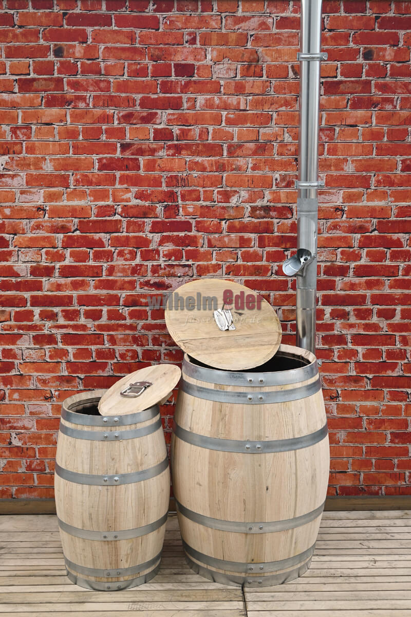 Rain barrel made from a 225 l or 228 l oak Barrique. The barrels are watertight and the head has been opened and equipped with a wooden grip. Rain barrels used to collect rainwater are great all-rounders. The rain barrels, which were once used to age beer, wine or distillates, are not only an eye-catching item in a park or in your garden. Wooden barrels are, without question, the most sustainable way of collecting water, as wood is after all a renewable resource. Quite apart from the lovely look of the barrels and their decorative character, a ton of water will be saved. This is not only environmentally friendly, but also allows you to mete out every drop of water to your plants or animals living in your garden.Available in a variety of sizes and finishes, rain barrels are a wonderful addition to everything from English gardens to weekend properties to sun terraces. Different designs - Color variations are possible and some barrels might have willow hoops and the metal hoops may show a film of rust. We sell these barrels unsorted!  A preselection is not possible. Every oak barrel is unique. Different colorations arose from the precious content that was once stored in them. Small notches in the wood or small bumps are not quality defects but rather determined by the nature of the construction and the prior use of the barrels. This product is not returnable.