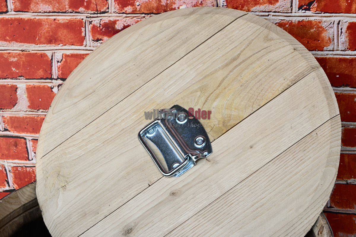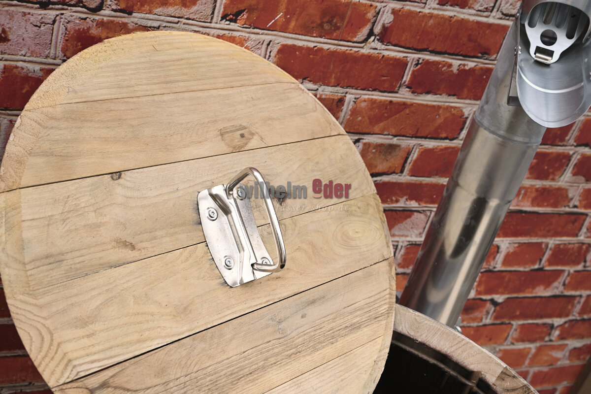 We offer this practical folding lid as an alternative to the standard lid. The hinged split lid is mounted with two hinges and a wooden handle, so it is easy to open. The fixed section has a recess on the side through which you can insert a downpipe up to a diameter of 100mm directly into the barrel. Please note: pictures are examples.  Colour variations are possible. Please specify the desired outer diameter in the comment field at the end of the online order. When ordered together with a rain barrel, we fit the lid to the size of the barrel.