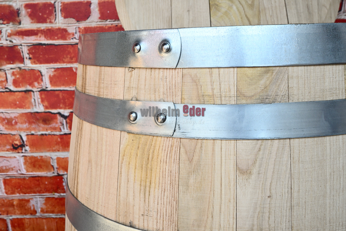 Rain barrel made of chestnut. These barrels are specifically made as decorative barrels unlike the oak barrels. The barrel head has been removed, made into a lid and a wooden handle added. A characteristic of chestnut wood is that it quickly darkens. Untreated barrels change their appearance when exposed to the weather. The hoops may be very quickly affected by flash rust and the tannins wash out of the barrel (tan). Therefore, do not place the chestnut barrels on high-quality patio slabs or paving stones.