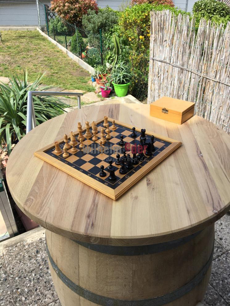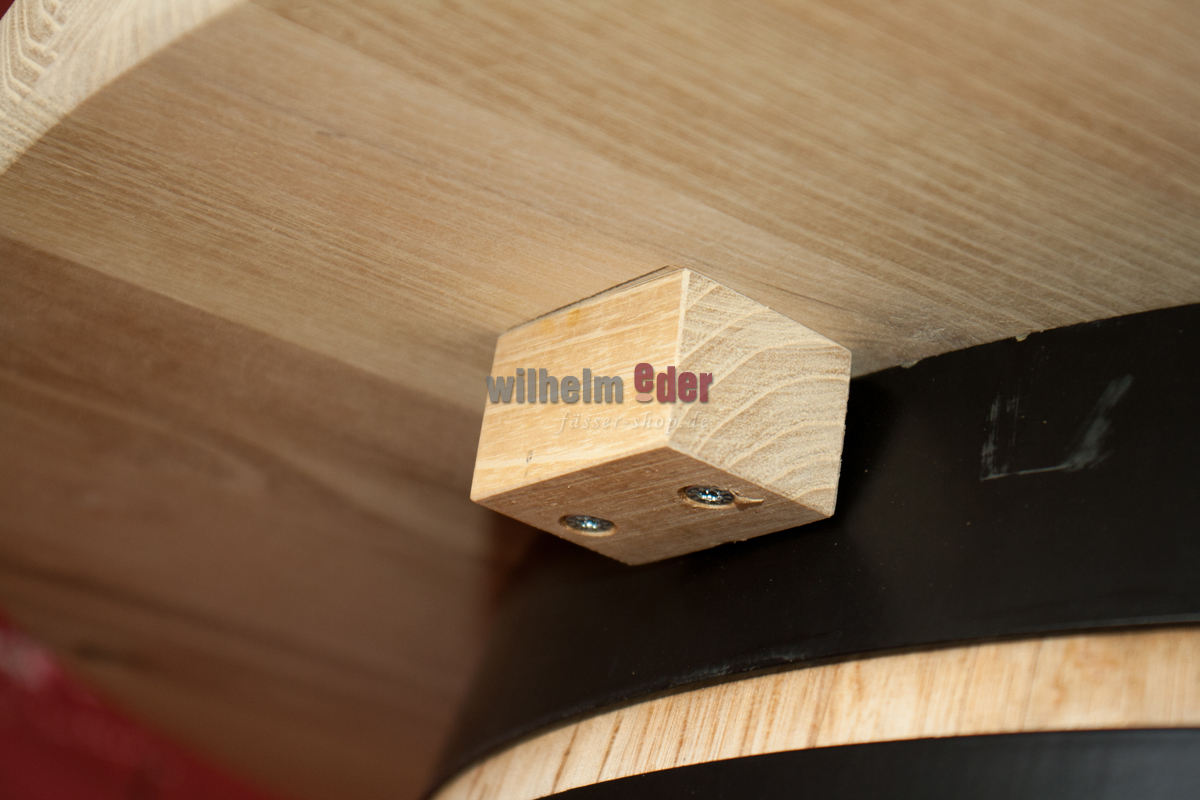 Three small wooden blocks are fixed to the underside of the tabletop, which allows it to be placed on a 225 l barrel.
