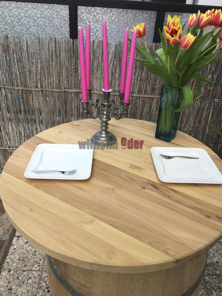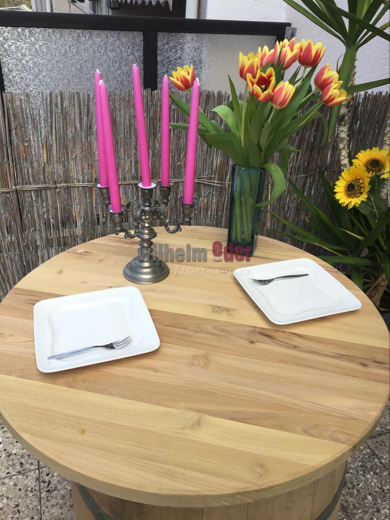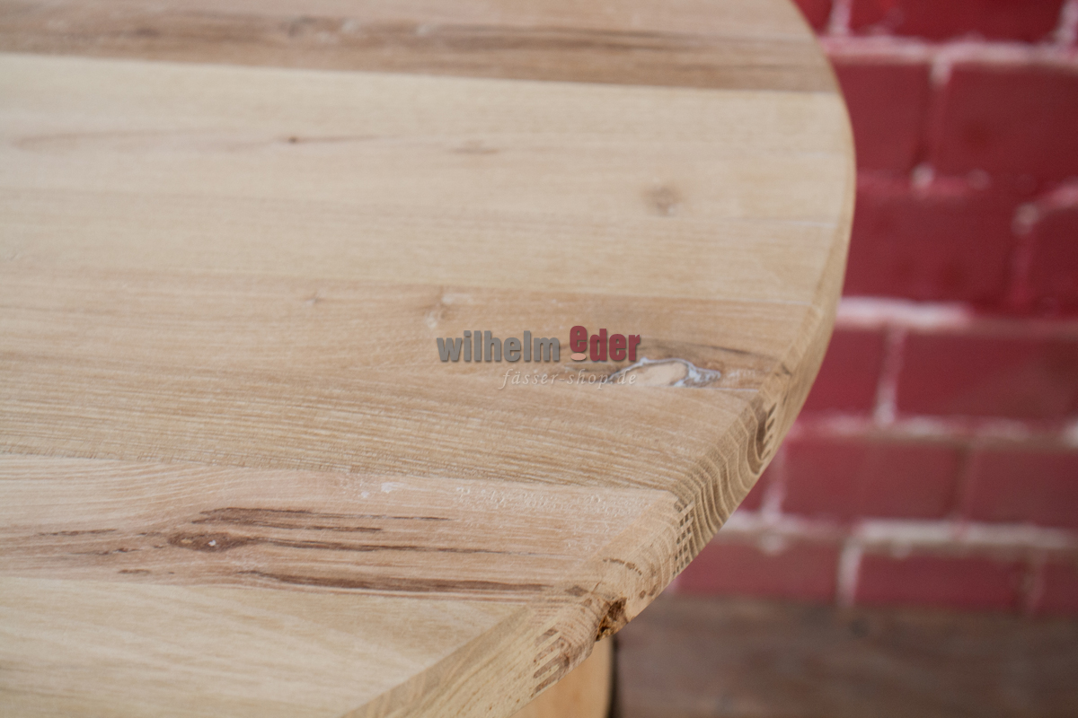 We produce each tabletop individually in our cooperage. We obtain the logs from the growing area Nordvogesen/Pfalz Forest. The table tops are made of solid square timber, notched and glued and the edges are chamfered. If desired, the top can be treated with linseed oil to give it a silky matt shine.