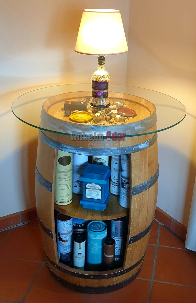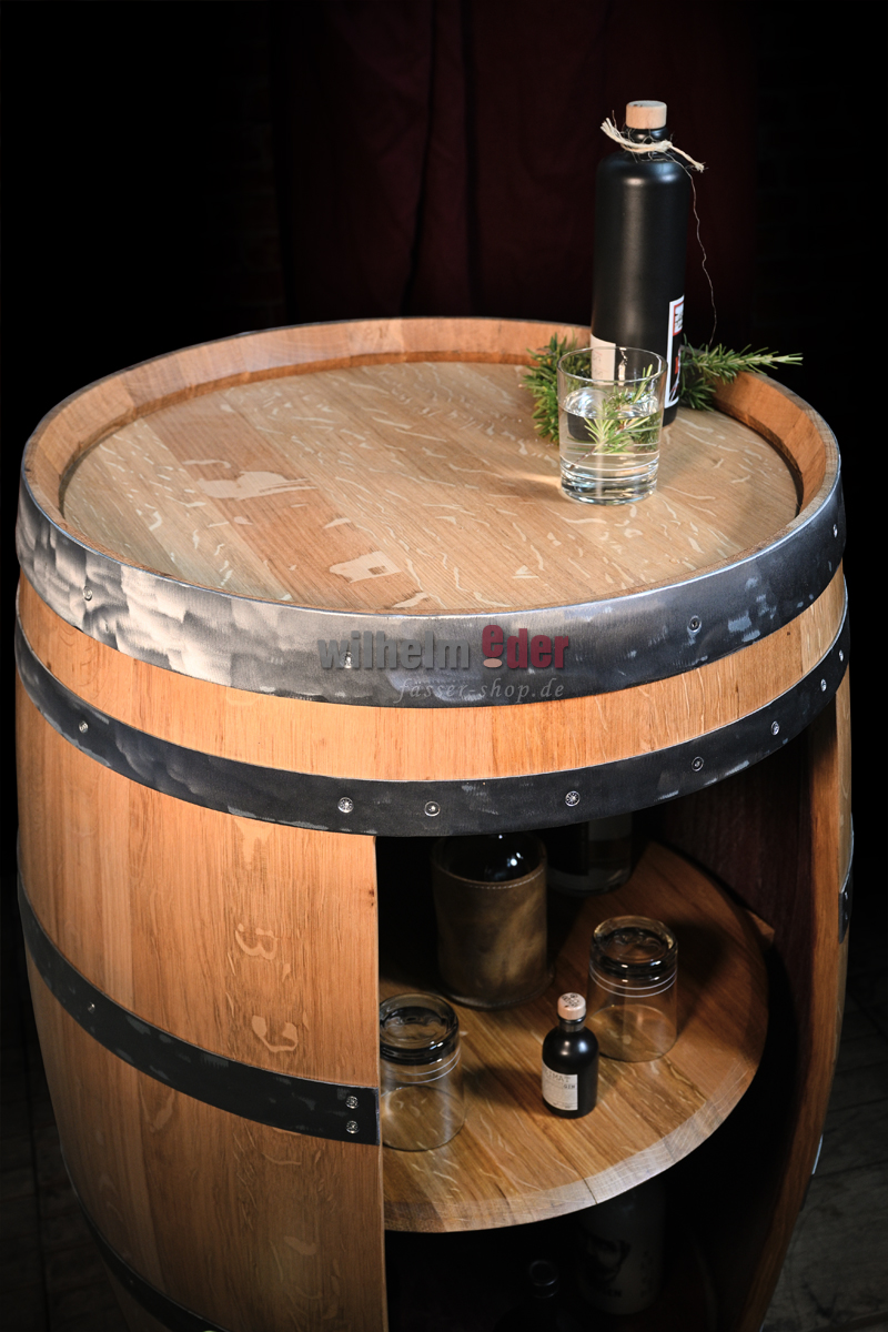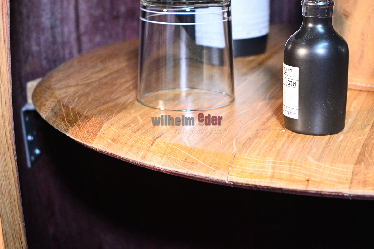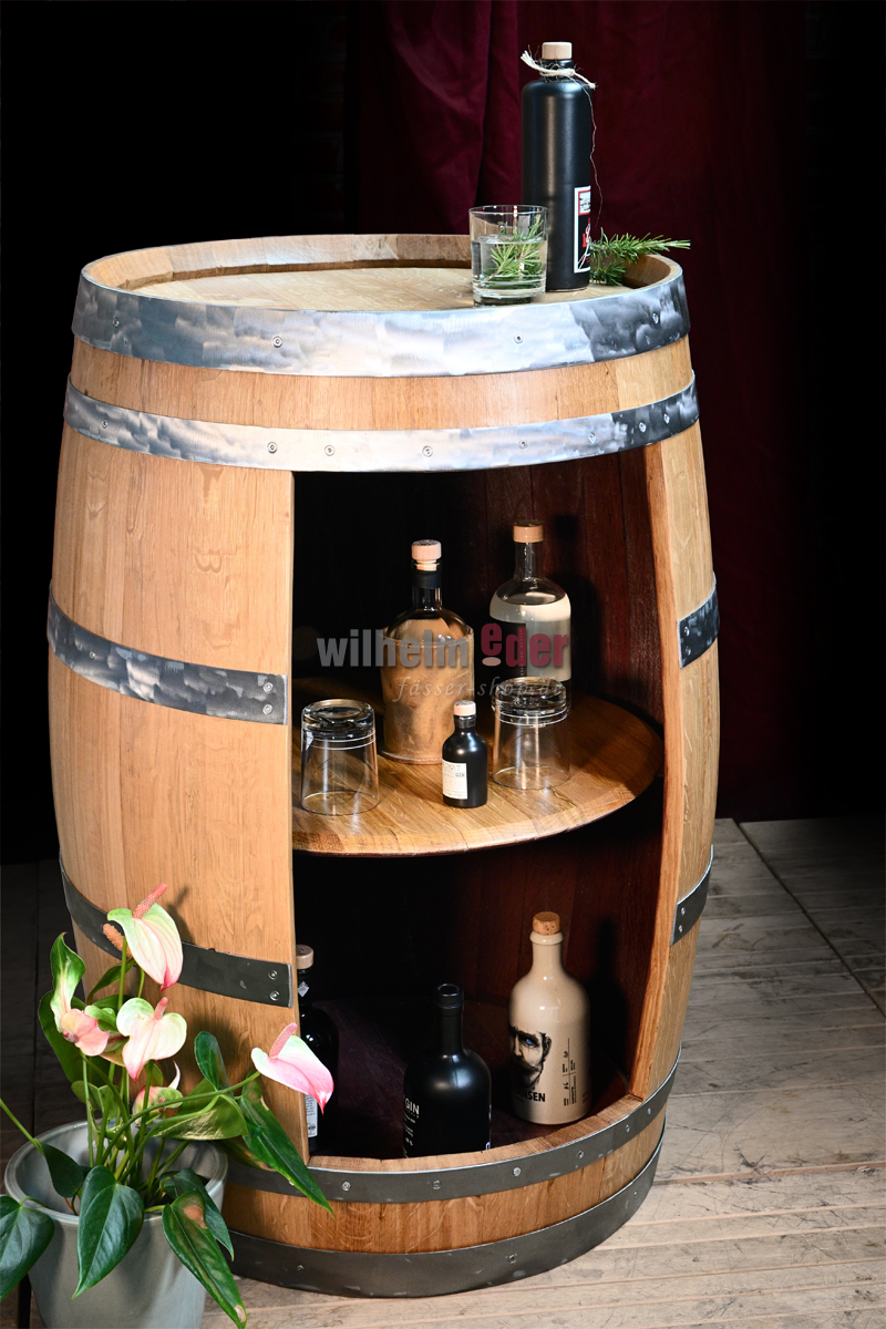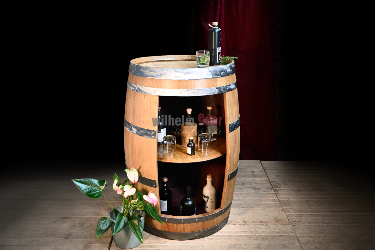 Shelf barrel of a used 225 l barrique barrel, altered by expert hand as exclusive wine storage shelf with a integrated barrique heads that can be used to store glasses and bottles.