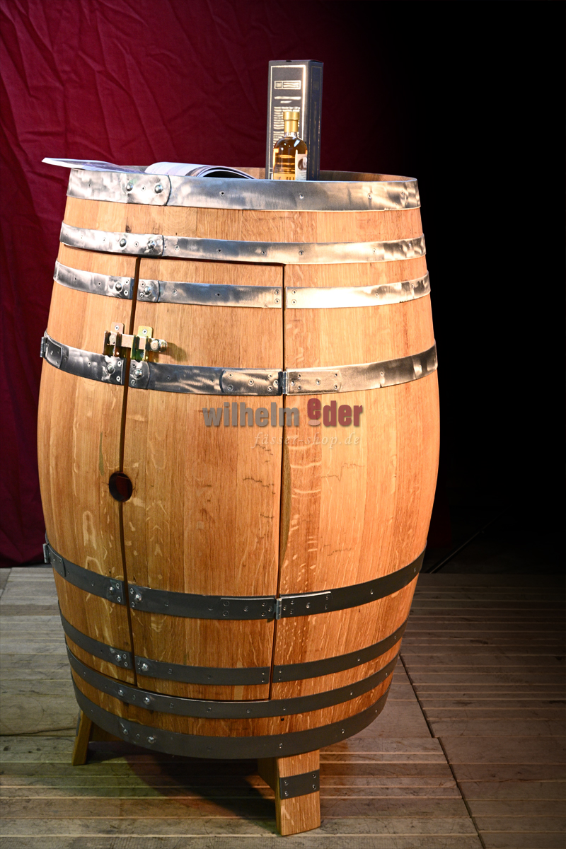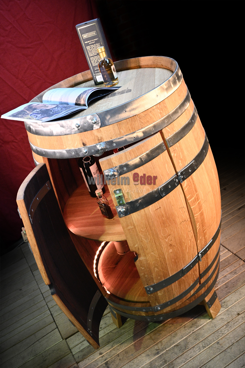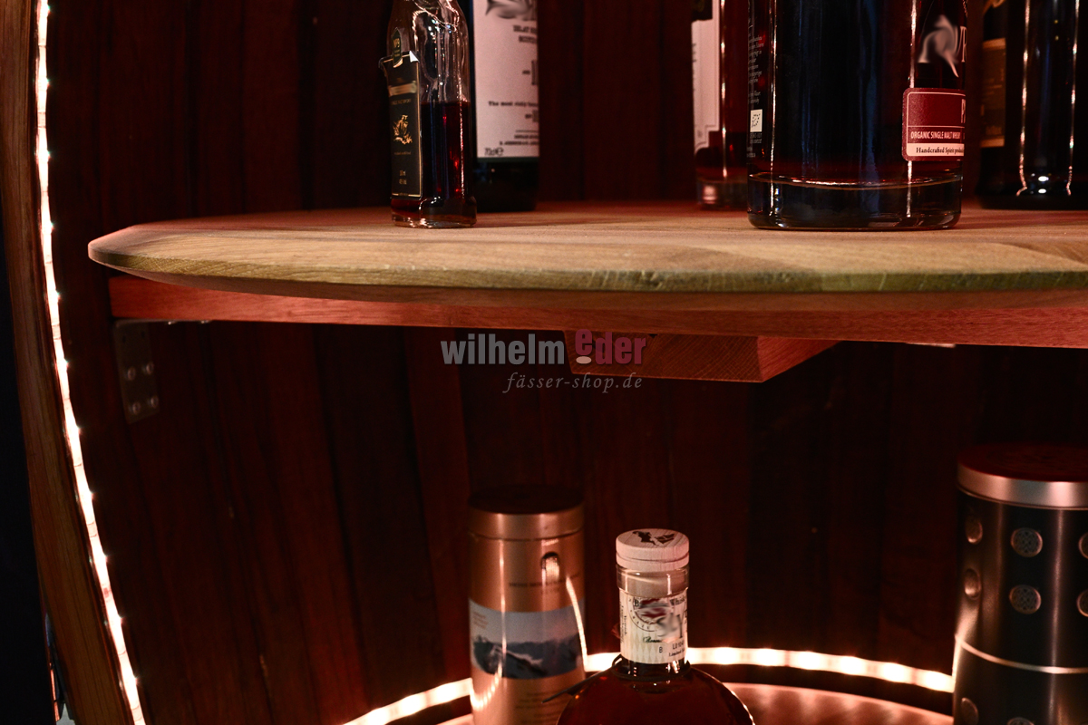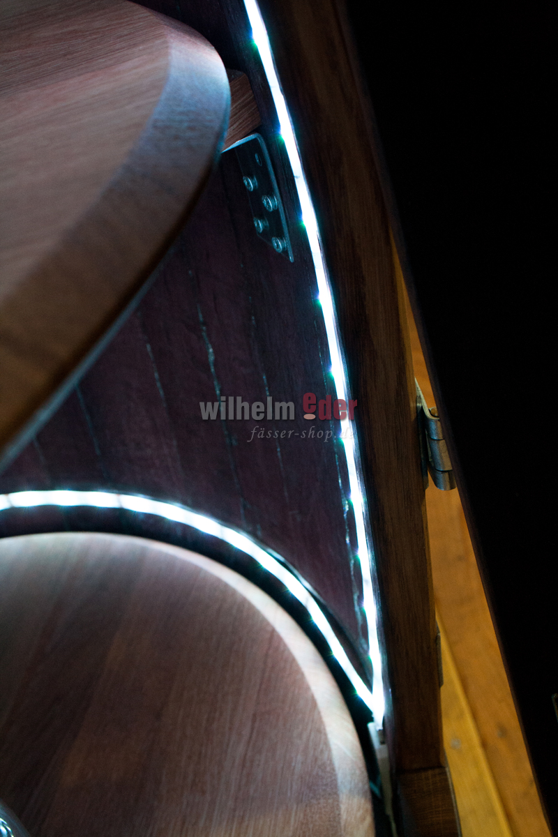 The double-leaf door opens to the outside. Inside, the barrel is untreated and shows a red wine coloring. Two rotatable shelves are the highlight in the barrel. The integrated LED strip ensures the right lighting.
