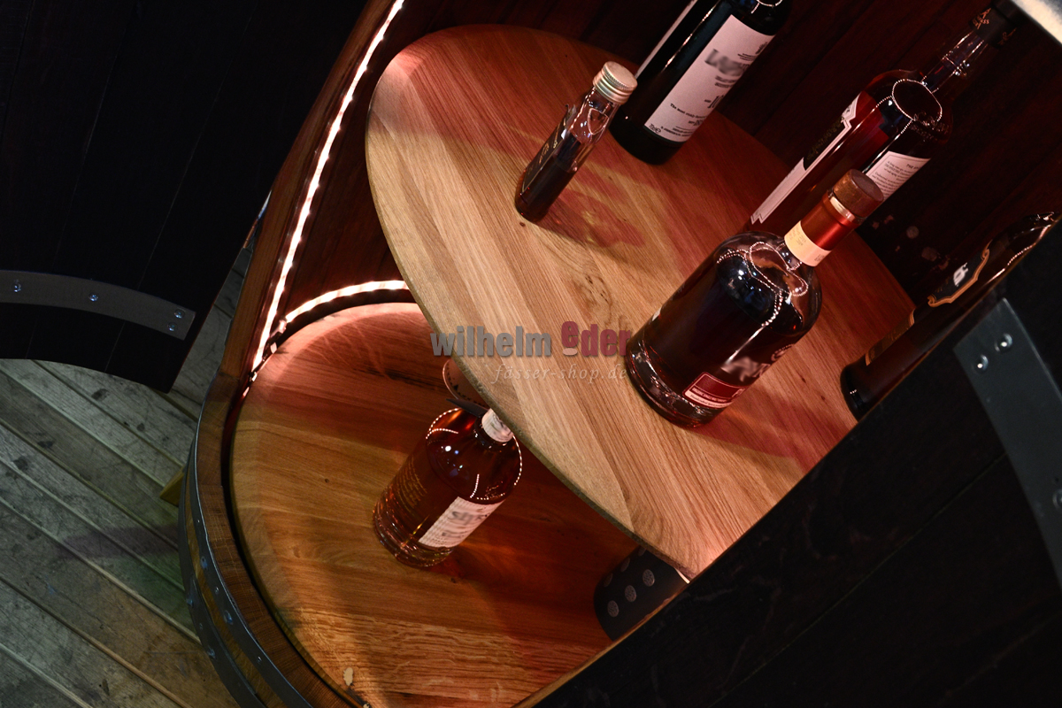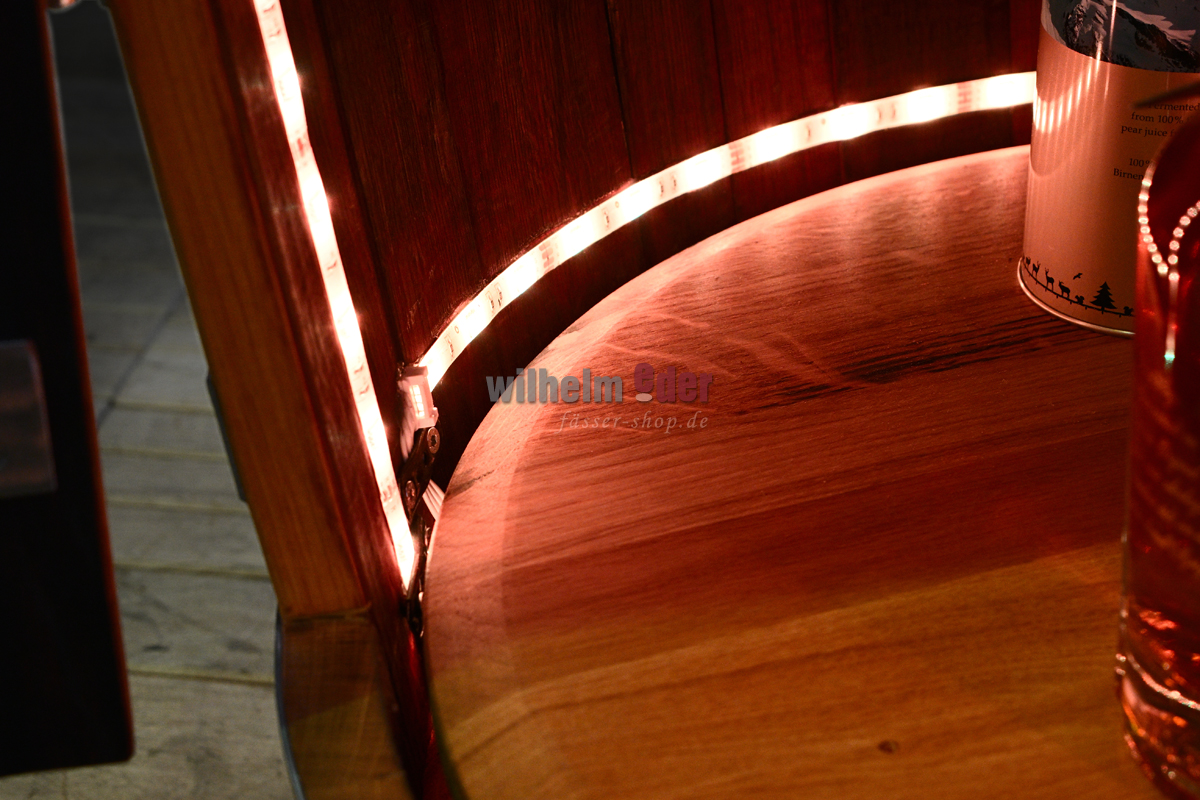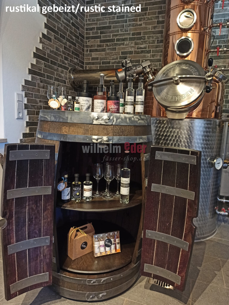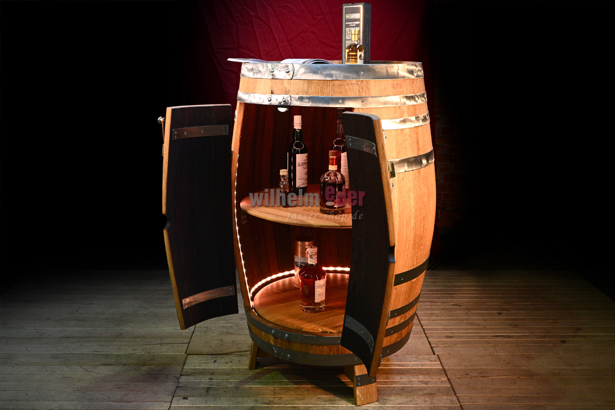 The double-leaf door opens to the outside. Inside, the barrel is untreated and shows a red wine coloring. Two rotatable shelves are the highlight in the barrel. The integrated LED strip ensures the right lighting.