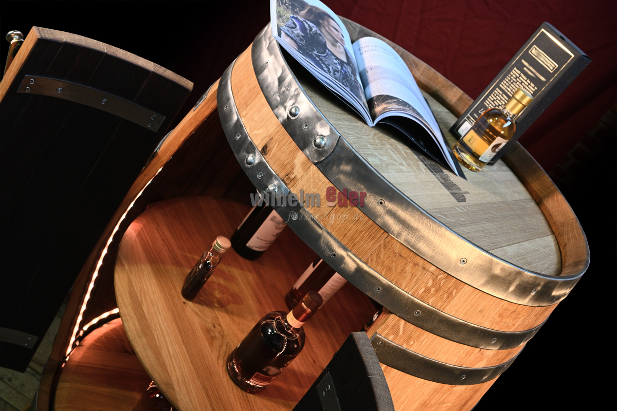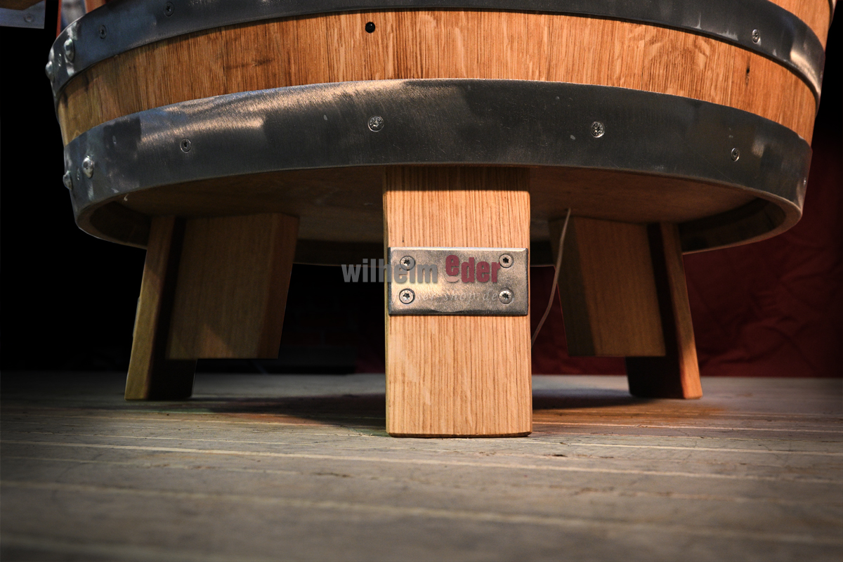 The barrel is dried, cleaned and ground. Each individual stave is glued and the brushed tires are fixed with screws. A surface treatment with linseed oil creates an exclusive look