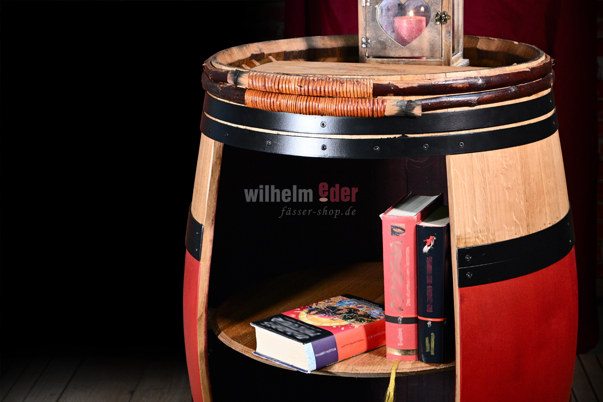 The barrel is open on the front side and worked by means of a barrel bottom to the shelf. The metal hoops are painted black.