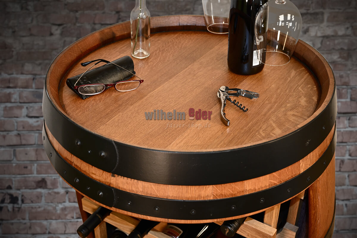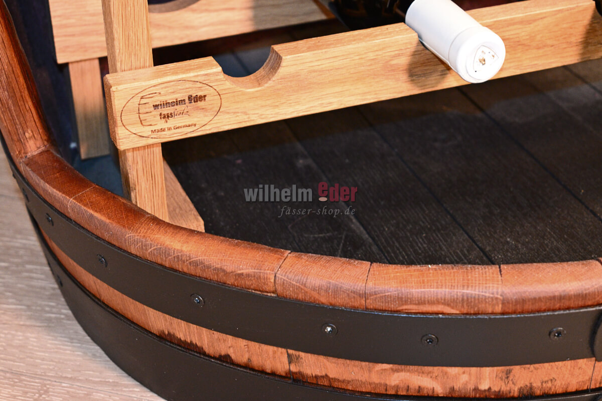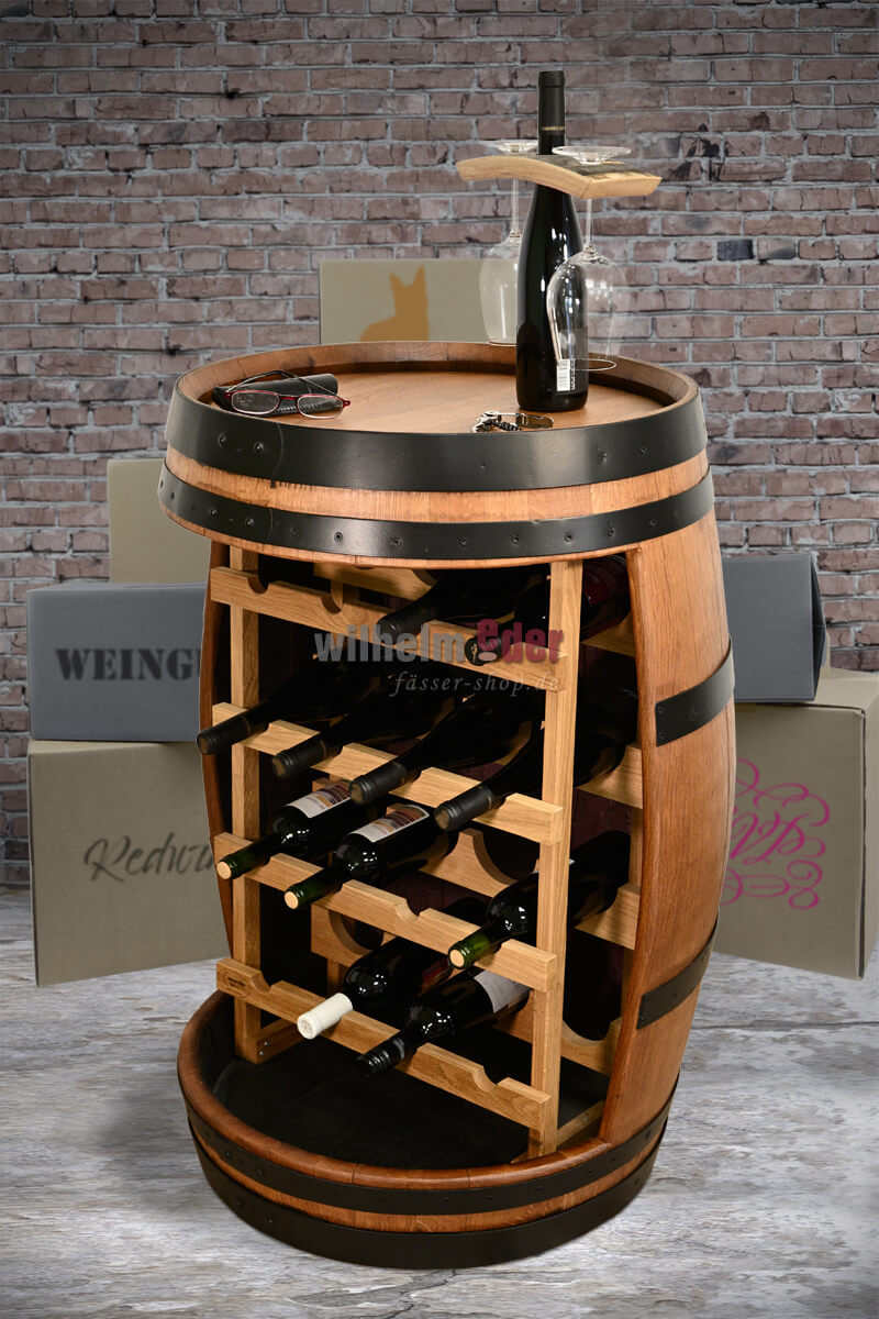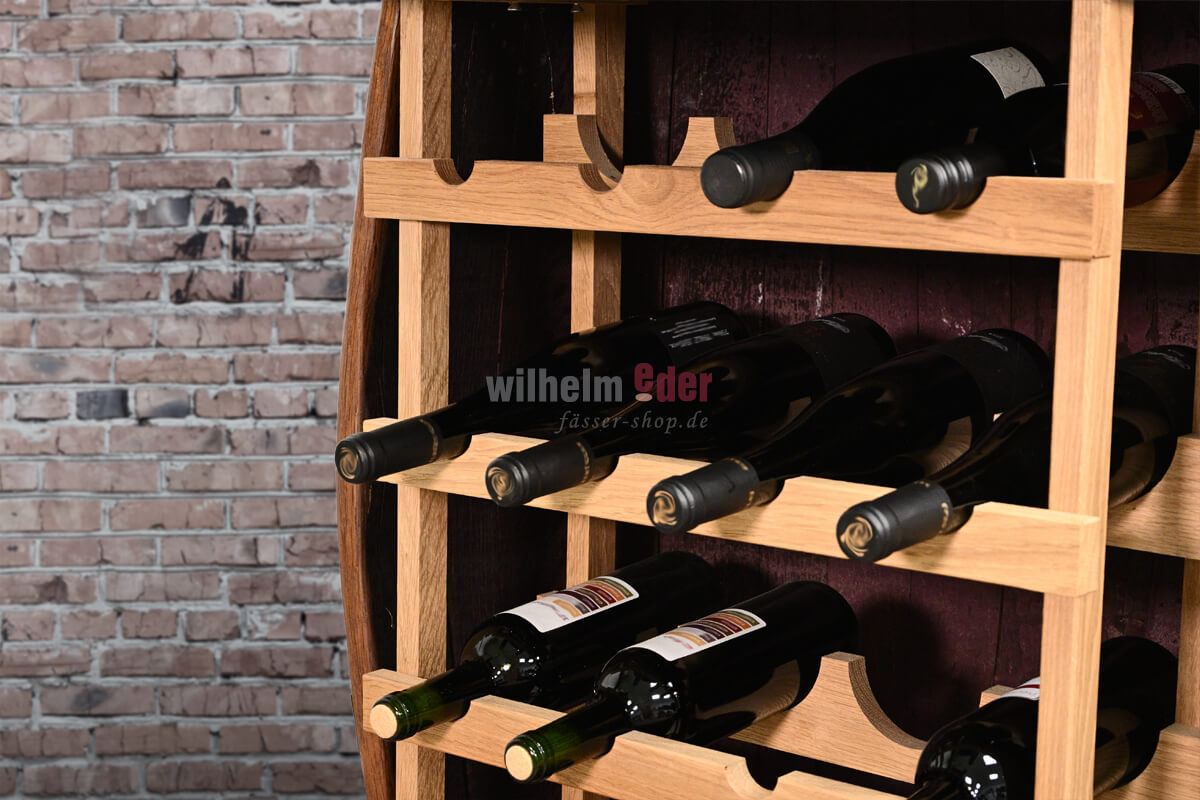 You want to store or decorate your wine bottles in a unique way? We offer you this attractive shelf barrel, produced from a 225 l oak barrel in our Wilhelm Eder cooperage in Bad Dürkheim.