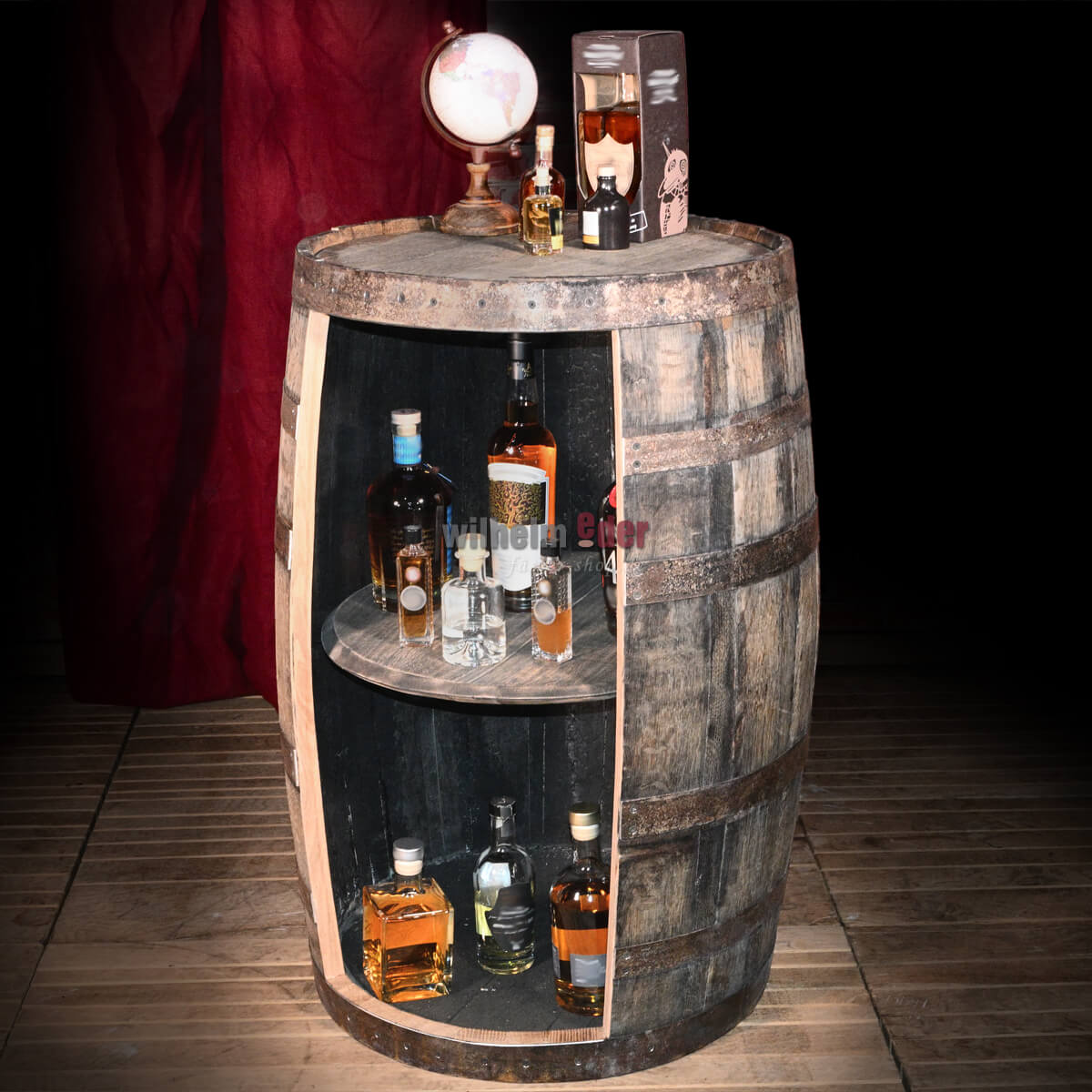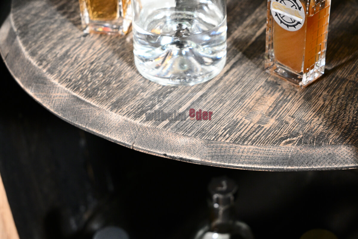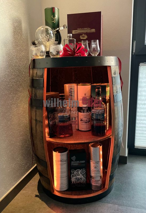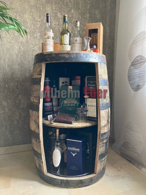 The barrel is opened at the front and equipped with a genuine Whisky lid as a shelf. The hoops were professionally screwed and protected against falling off.