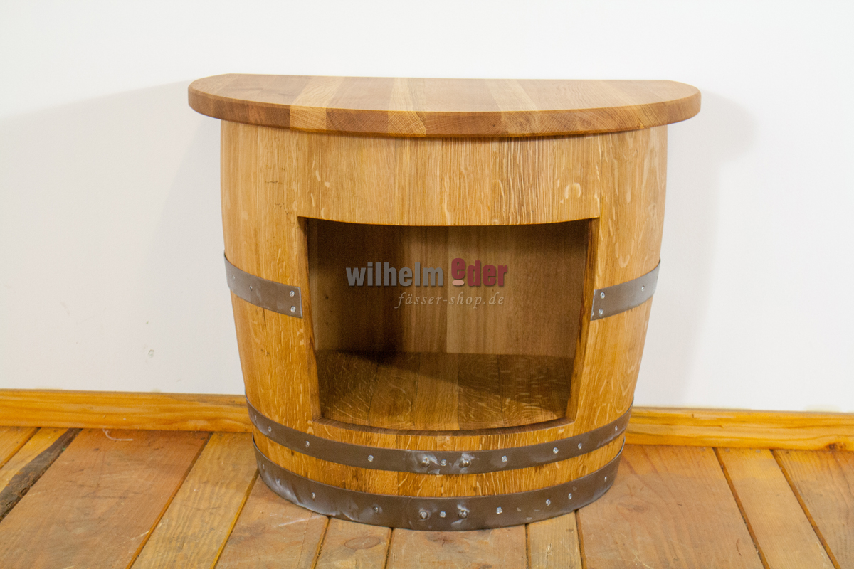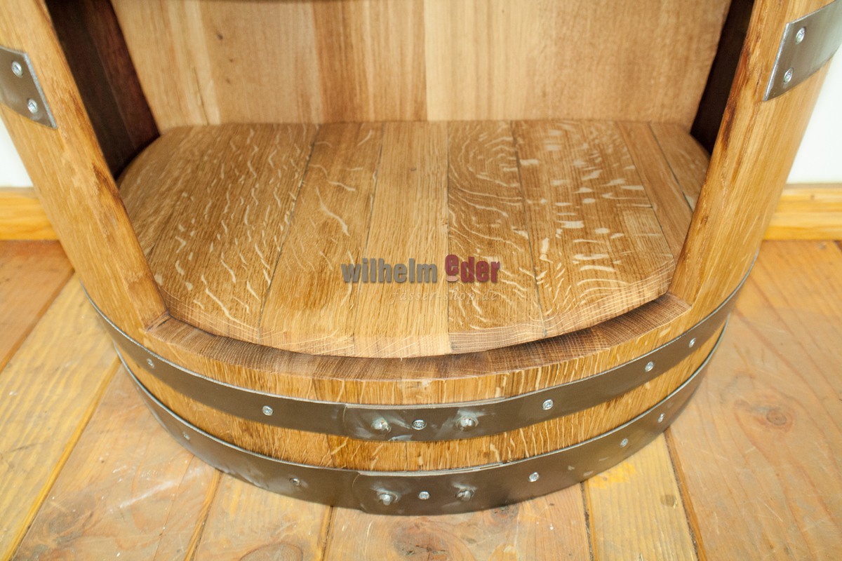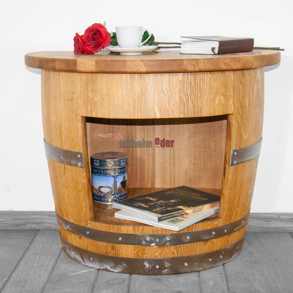 The beautiful appearance is rounded off with a small insert for your beautiful things and by the solid semicircular table top made of oak. The barrel hoops are brushed and the complete shelf is covered with clear varnish.