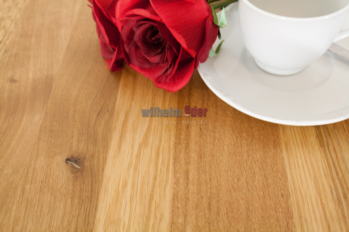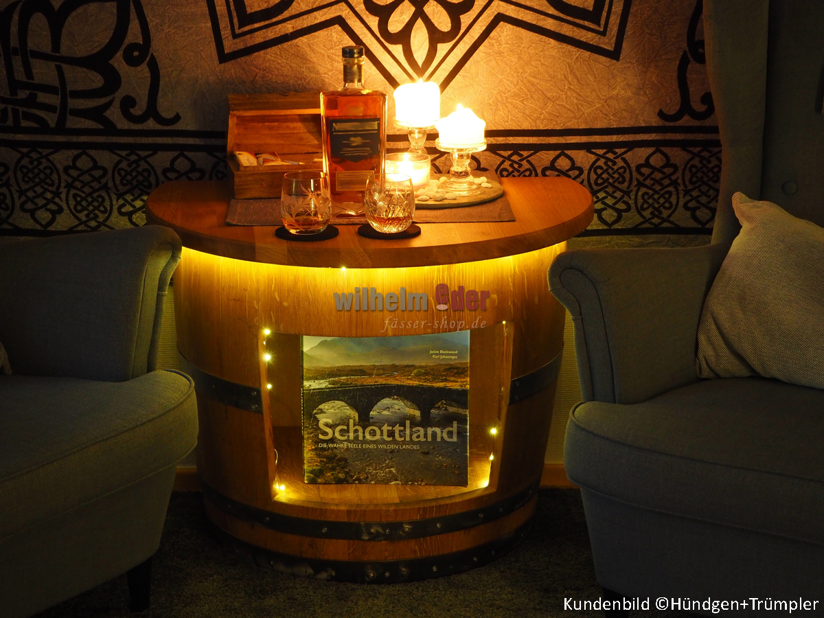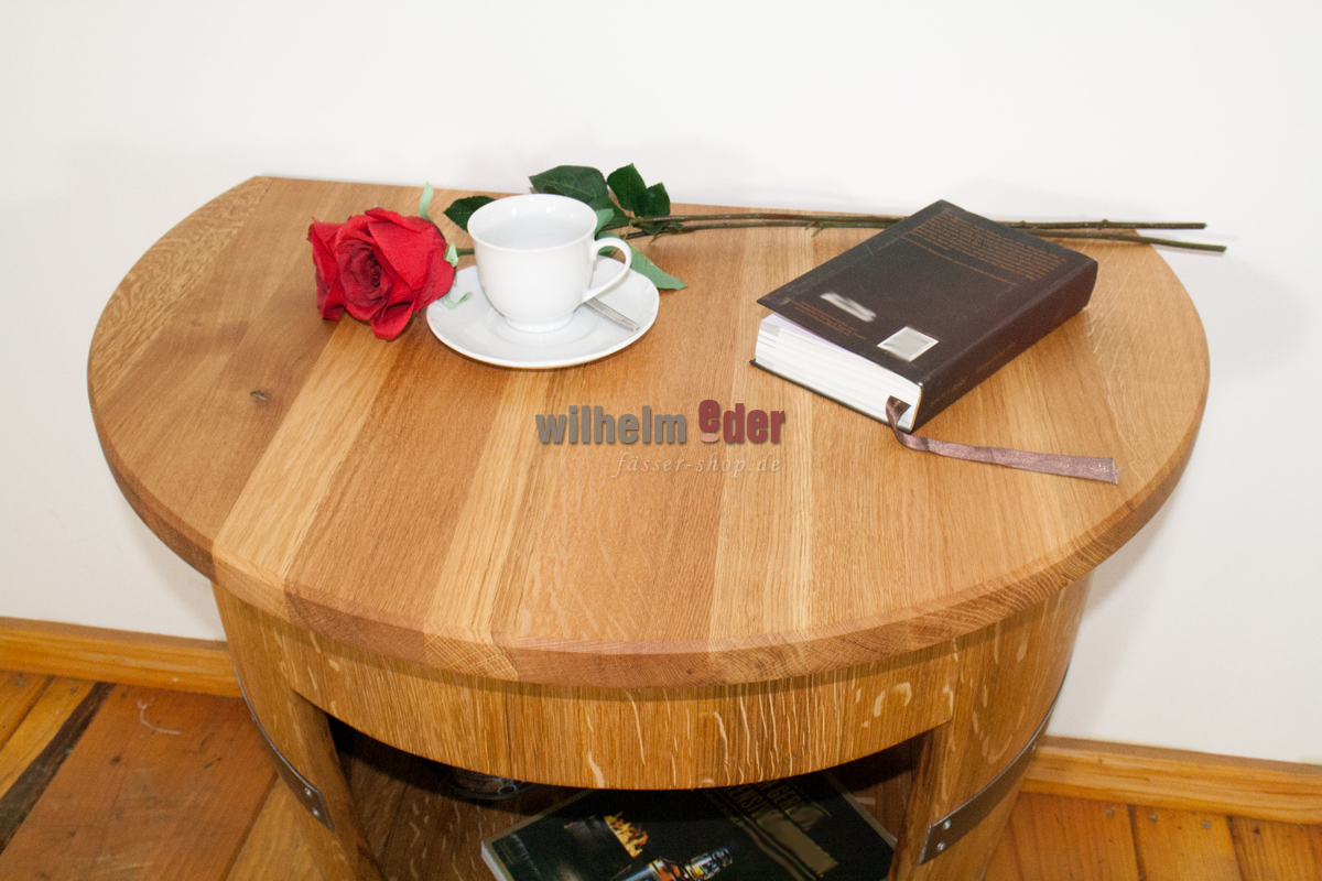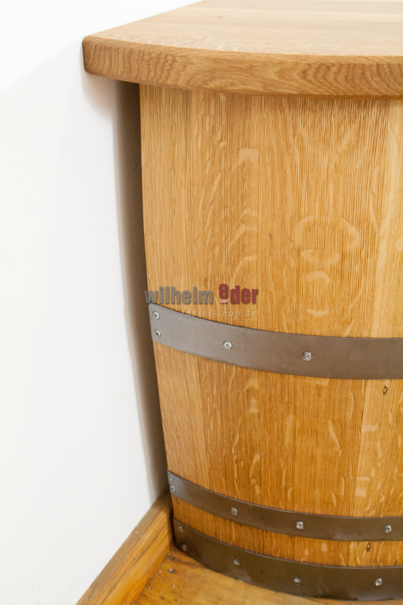 The beautiful appearance is rounded off with a small insert for your beautiful things and by the solid semicircular table top made of oak. The barrel hoops are brushed and the complete shelf is covered with clear varnish.