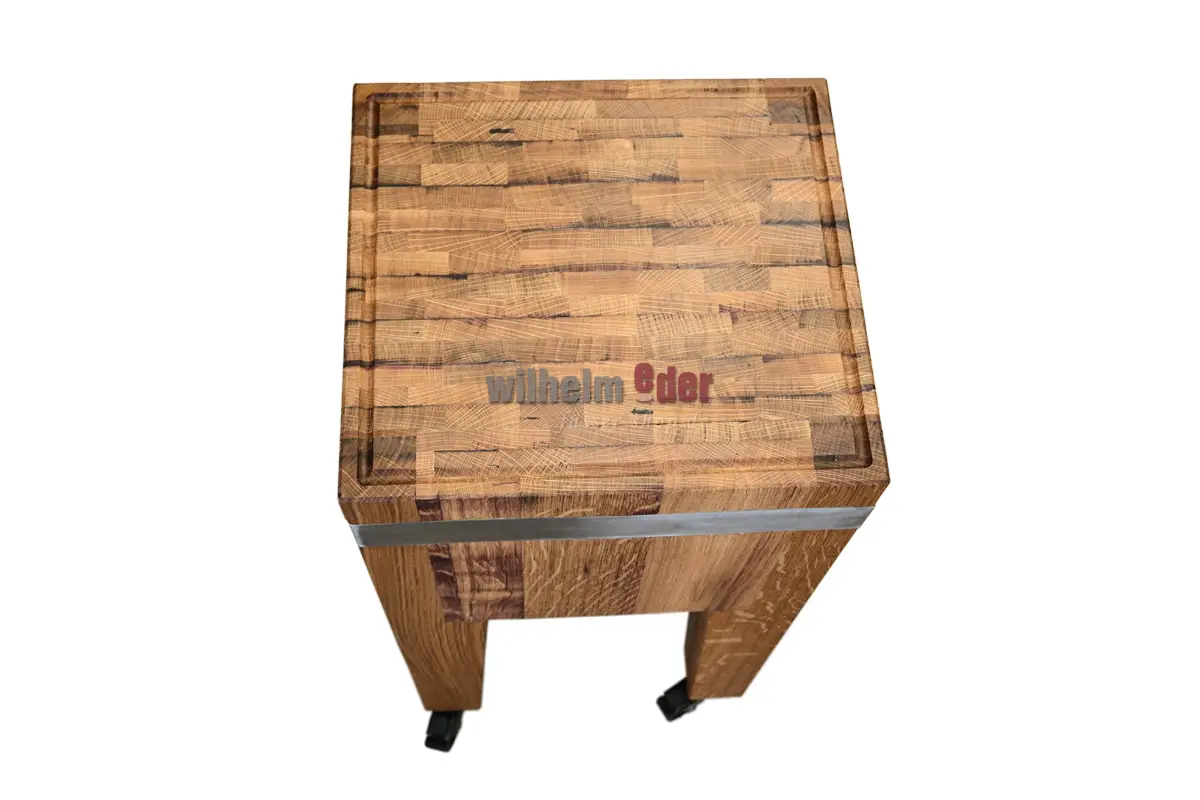 The mobile, solid presentation trolley, made from the heads of 25 red wine barrels, is not only a handcrafted work of art, but also a versatile a versatile addition to the kitchen. With a total height of 85 cm and 4 castors, it combines tradition with innovation.