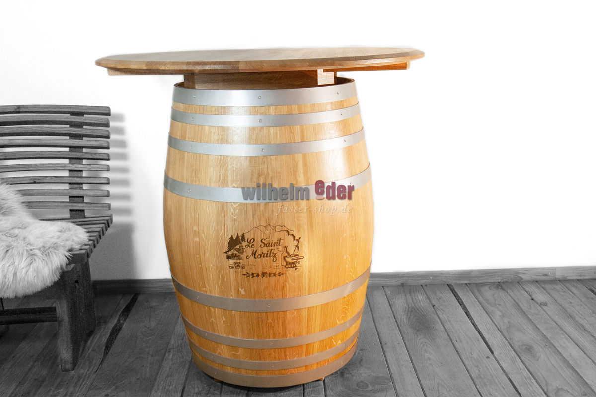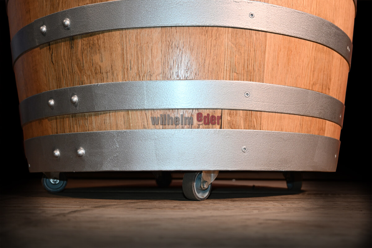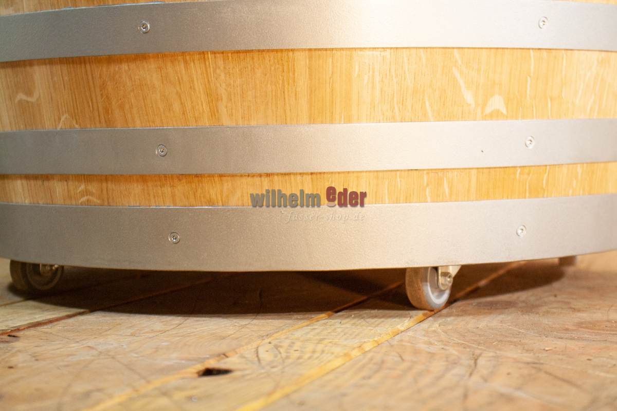 Made from a used oak barrel 300 l, professionally cleaned and sanded, provided with a round barrel plate. The galvanized hoops have been pained silver. The round barrel plate by means of a solid oak substructure is screwed on the barrel. This standing table is mounted on four rollers and one roller can be used as a parking brake. To avoid theft, this table is equipped with a metal hoeing.