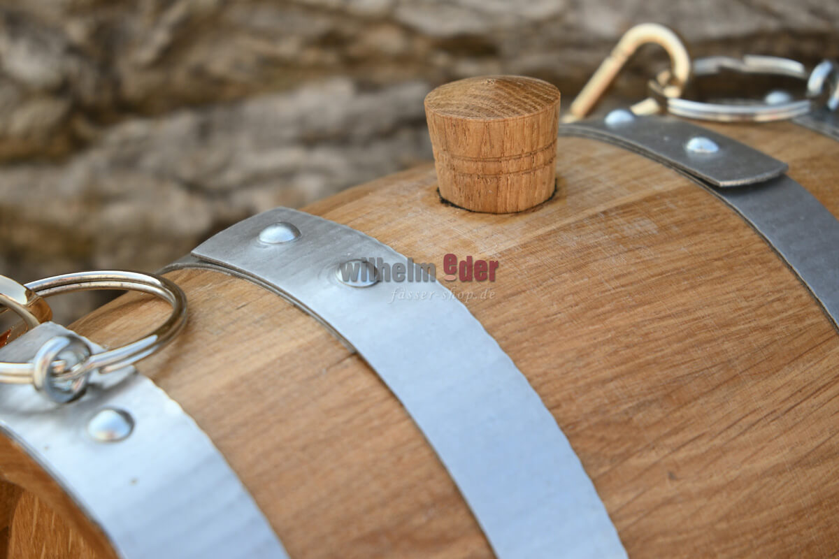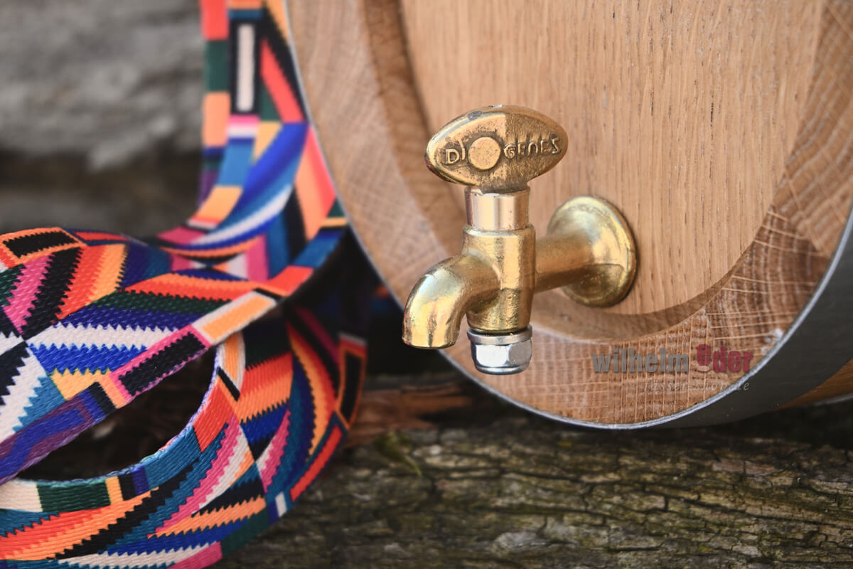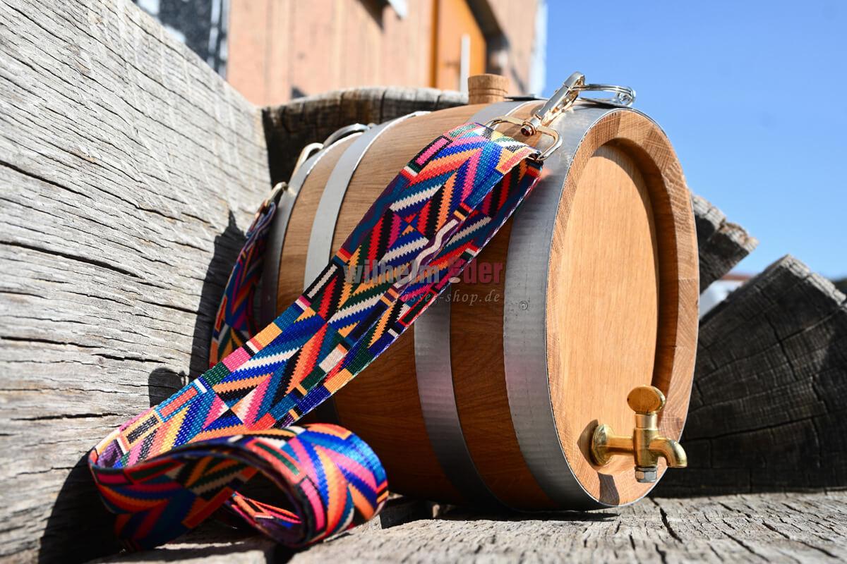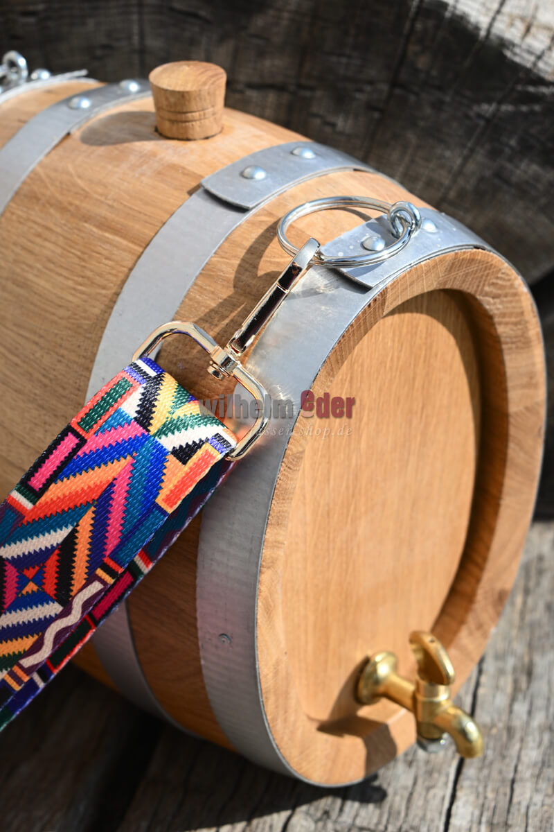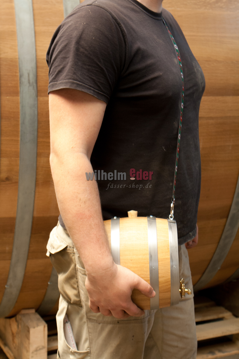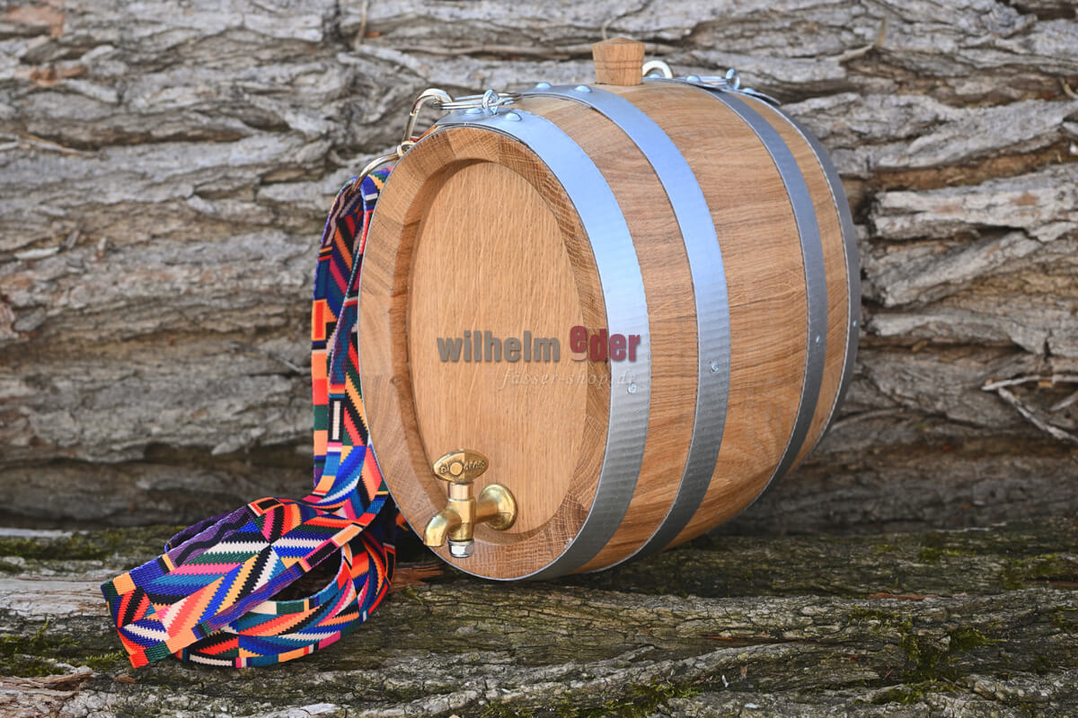 A small oval barrel to serve alcohol which can be put around your shoulders. This oak barrel with galvanized hoops has a food safe cover inside. Hence the stored alcohol can’t age in this barrel anymore. Thanks to the brass tap you can draw the precious alcohol during hiking, at a stag night or for a promotion. You can put the barrel around your shoulder thanks to a band (different looks), which is included.