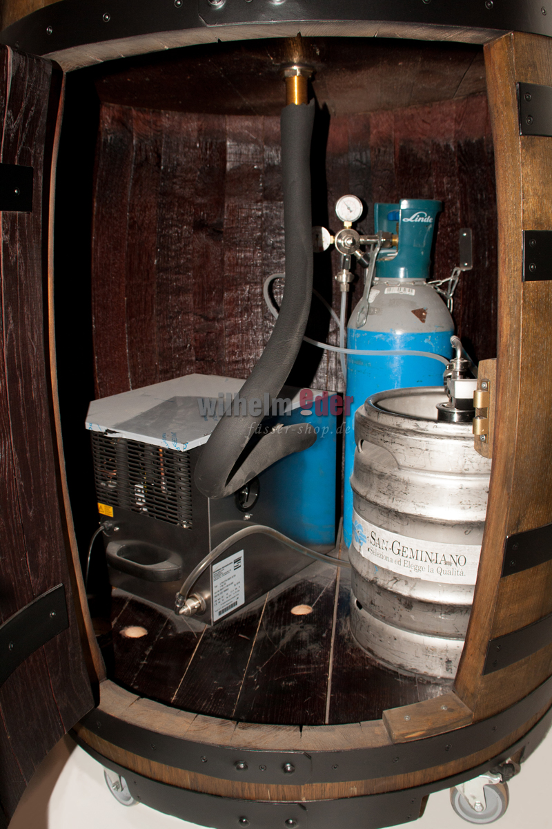 A side opening serves the conducting of necessary electric connection, a pressure regulator with level indicators in “Bar”. Beer barrel connecting KEG - Connecting flat or basket fitting (as the customer wishes). A securing chain for the carbonated bottle and 1 x drip tray 20 x 30 cm are included.