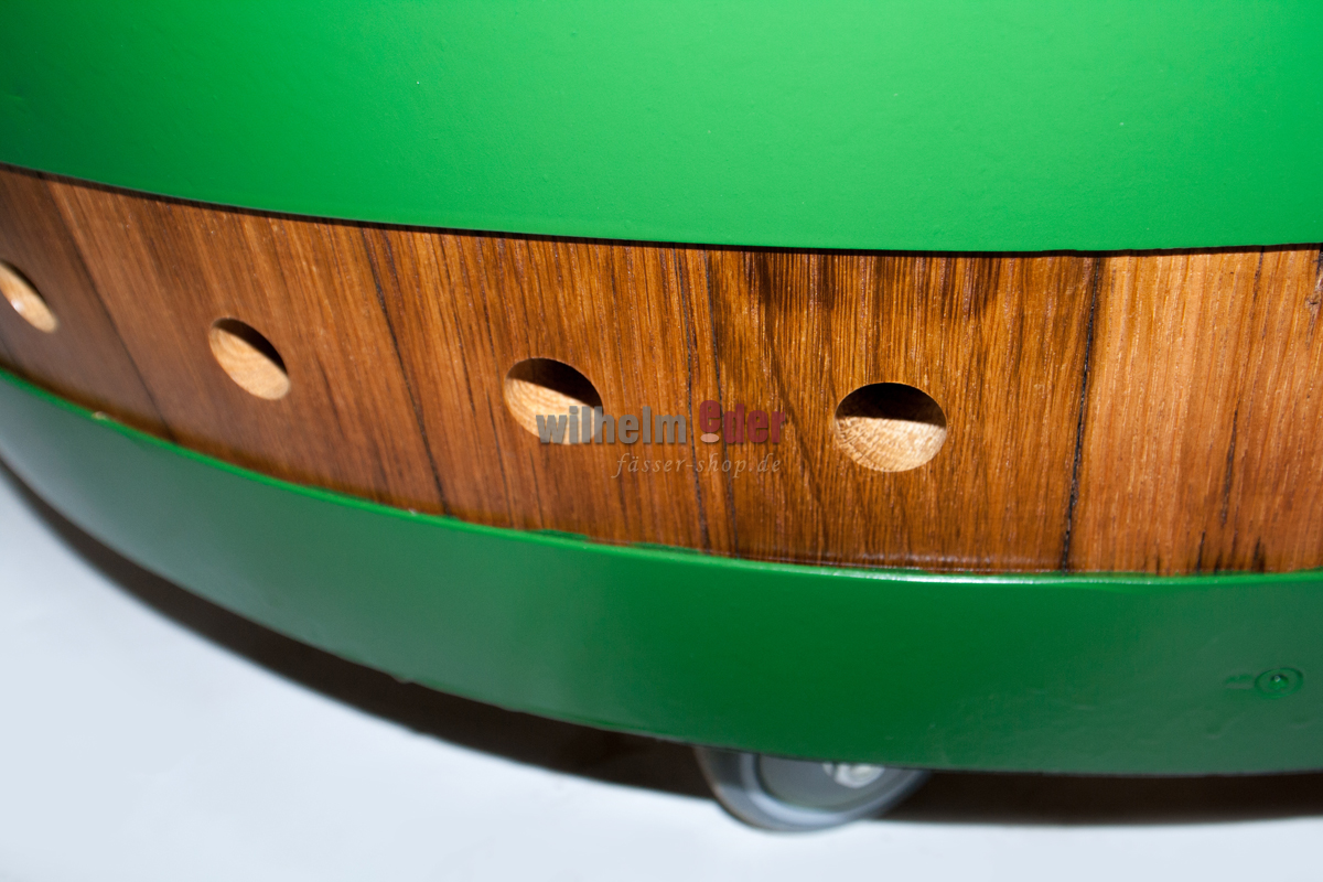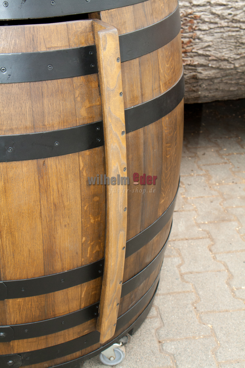 This barrel is opened at the front. The hoops have been painted and have been screwed professionally to secure against falling. The polished barrel has been stained and has been treated with boat varnish. The bottom has been strengthened professionally.