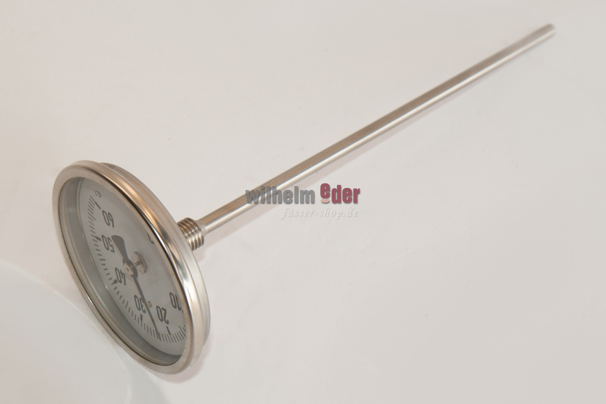 The thermometer is made of V4A stainless steel and has been filled with glycerin. It is for the usage in mash tanks in combination with the heat changing plates.