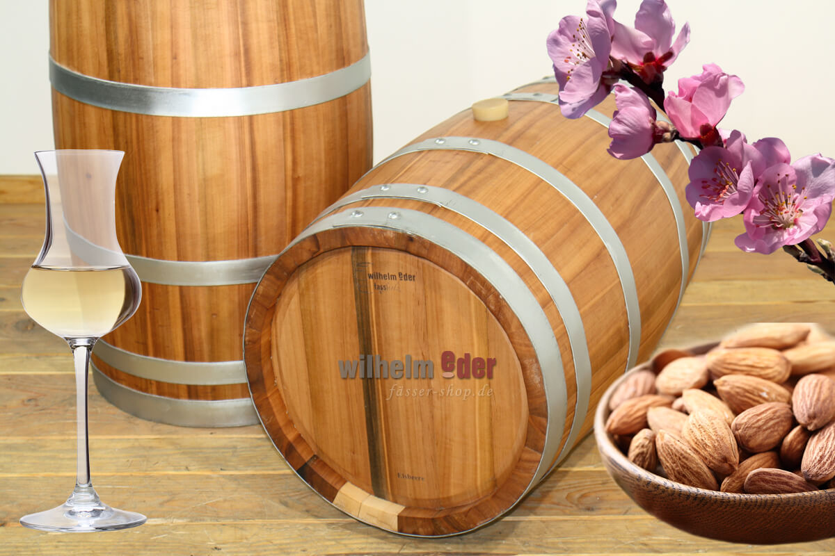 A barrel made in our cooperage under our own brand EDER - FassStolz®. The barrel consists exclusively of the air-dried deciduous wood of the Elsbeere (Sorbus torminalis). The special distillate barrel is equipped with hot-dip galvanised hoops, treated with a breathable, food-certified glaze on the outside and lightly toasted on the inside.