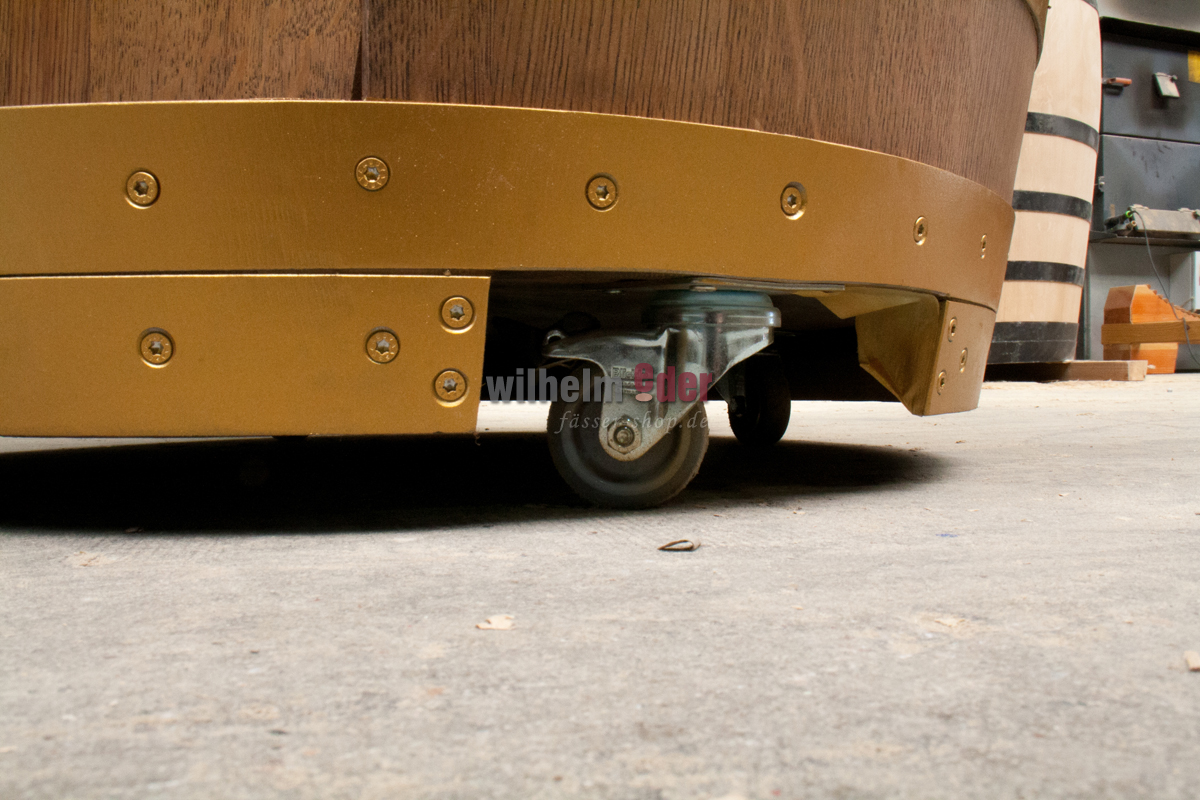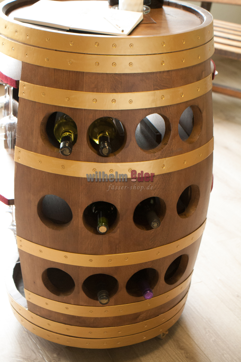An exclusive wine shelf made of a used 225 l wine barrel which has been converted into a mobile and heavy wine bar in elaborate craftsmanship.