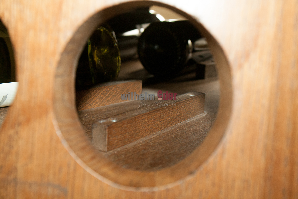 The barrel has been professionally cleaned, then dried up and glued. A shelf system for wine bottles with support to content of 150 cl has been installed inside of the barrel. The shelf is made of oak wood as well as the barrel.