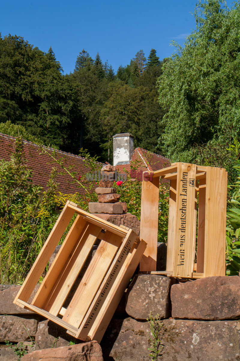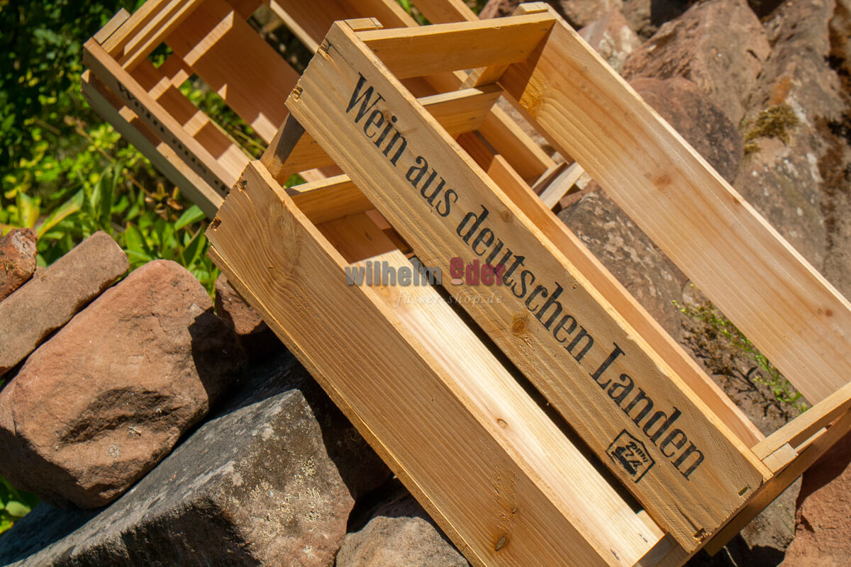 We have here a new edition of the wine crates - wine from German countries - or - wine gives joy -. The used crates are rare, since the winegrowers today mostly lay and transport their wine bottles in other containers. Therefore we offer the crate again. Due to its special charisma, it is in no way inferior to the old original.