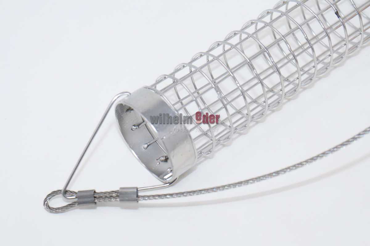 Conical wooden bung with stainless steel eyelet in a set with a stainless steel basket attached to the rope, which allows the hanging of several sulphur cuts in the barrel.